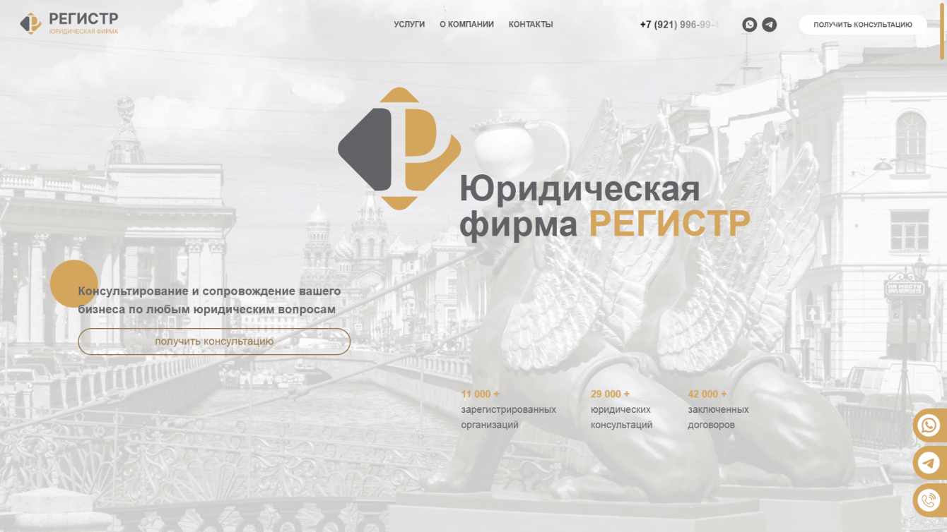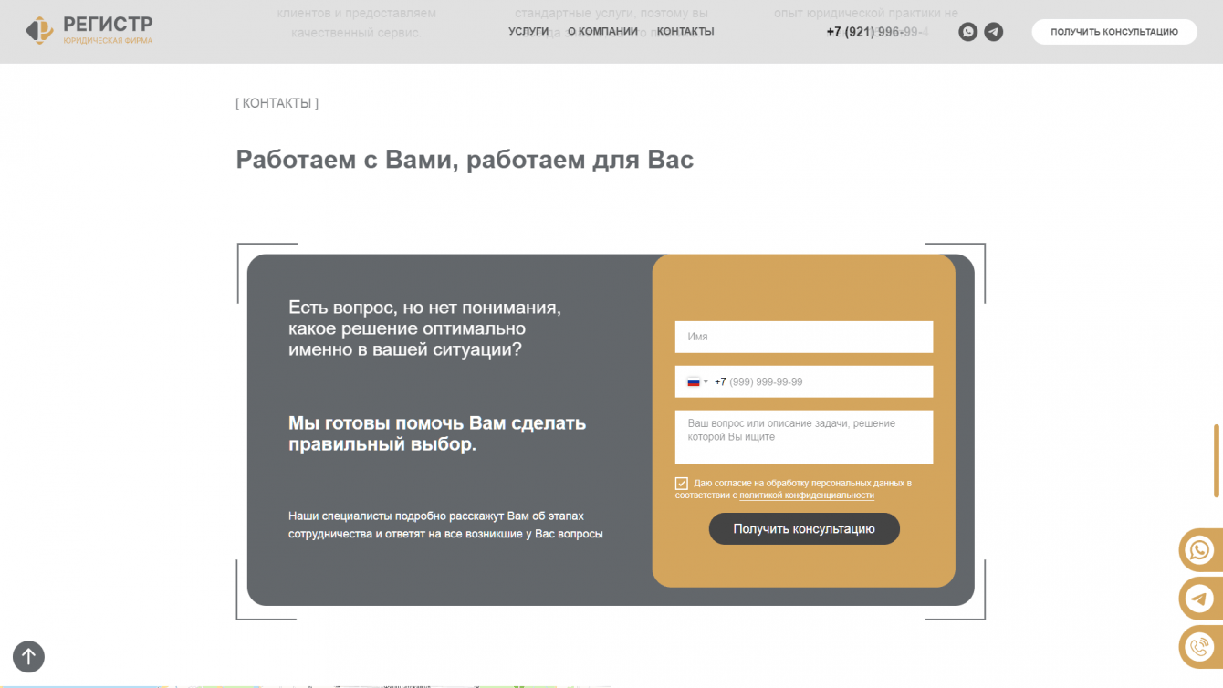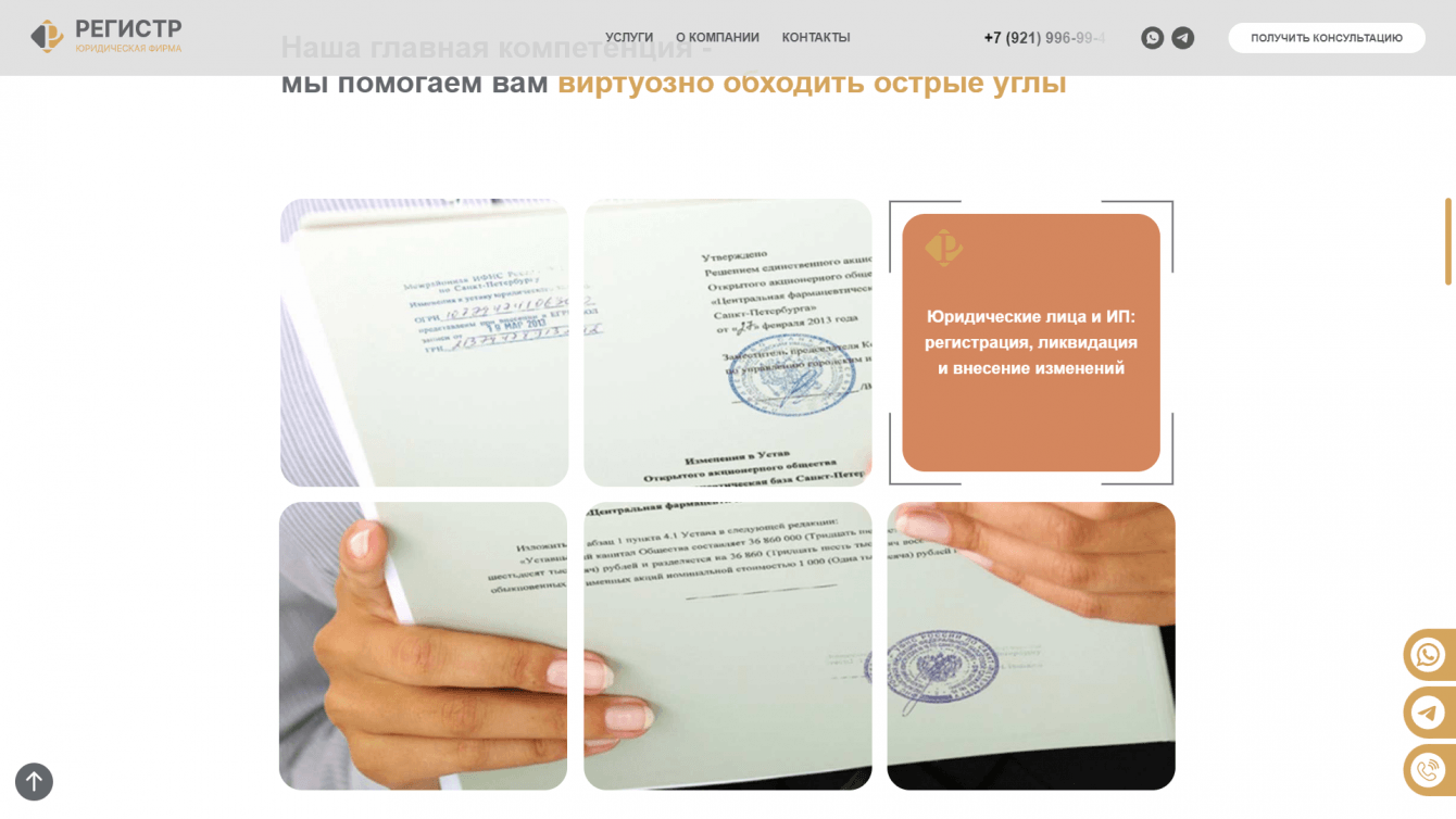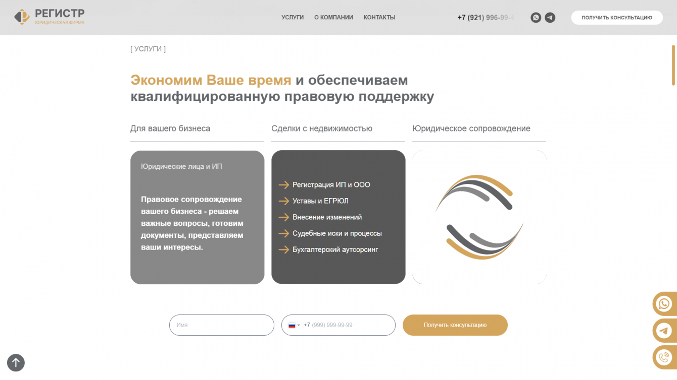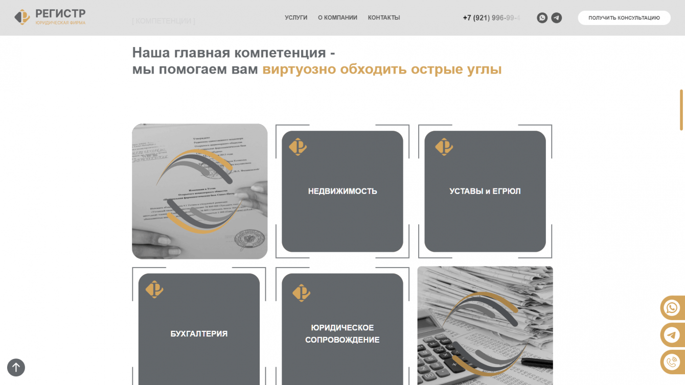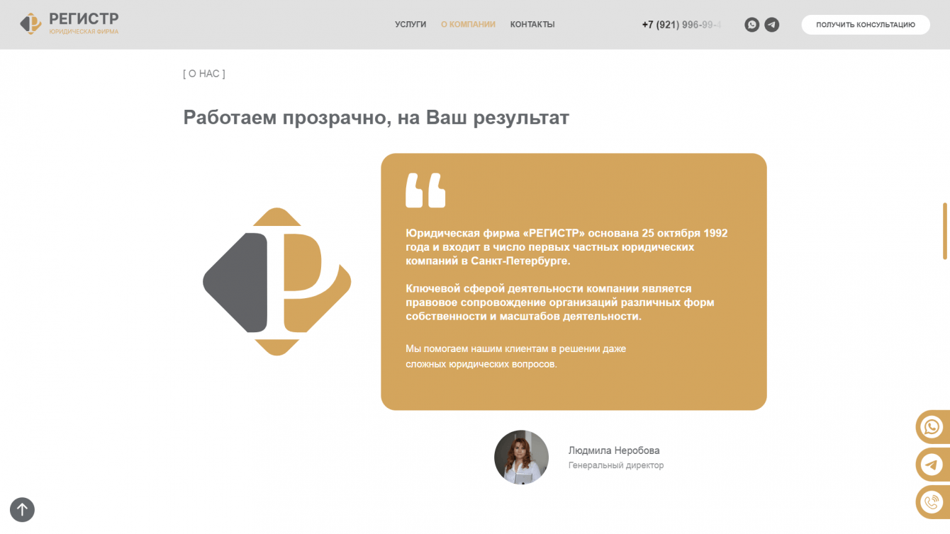 Заказчик дал задание разработать фирменный стиль и создать лаконичный сайт с индивидуальным дизайном. Сайт должен был содержать информацию об основных услугах фирмы.