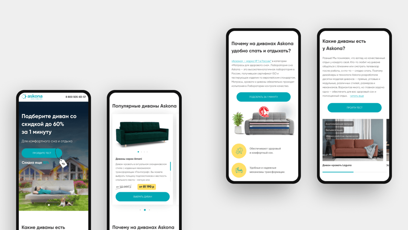 В завершающем блоке подчеркиваем преимущества диванов Аскона и подтверждаем их премиями компании.