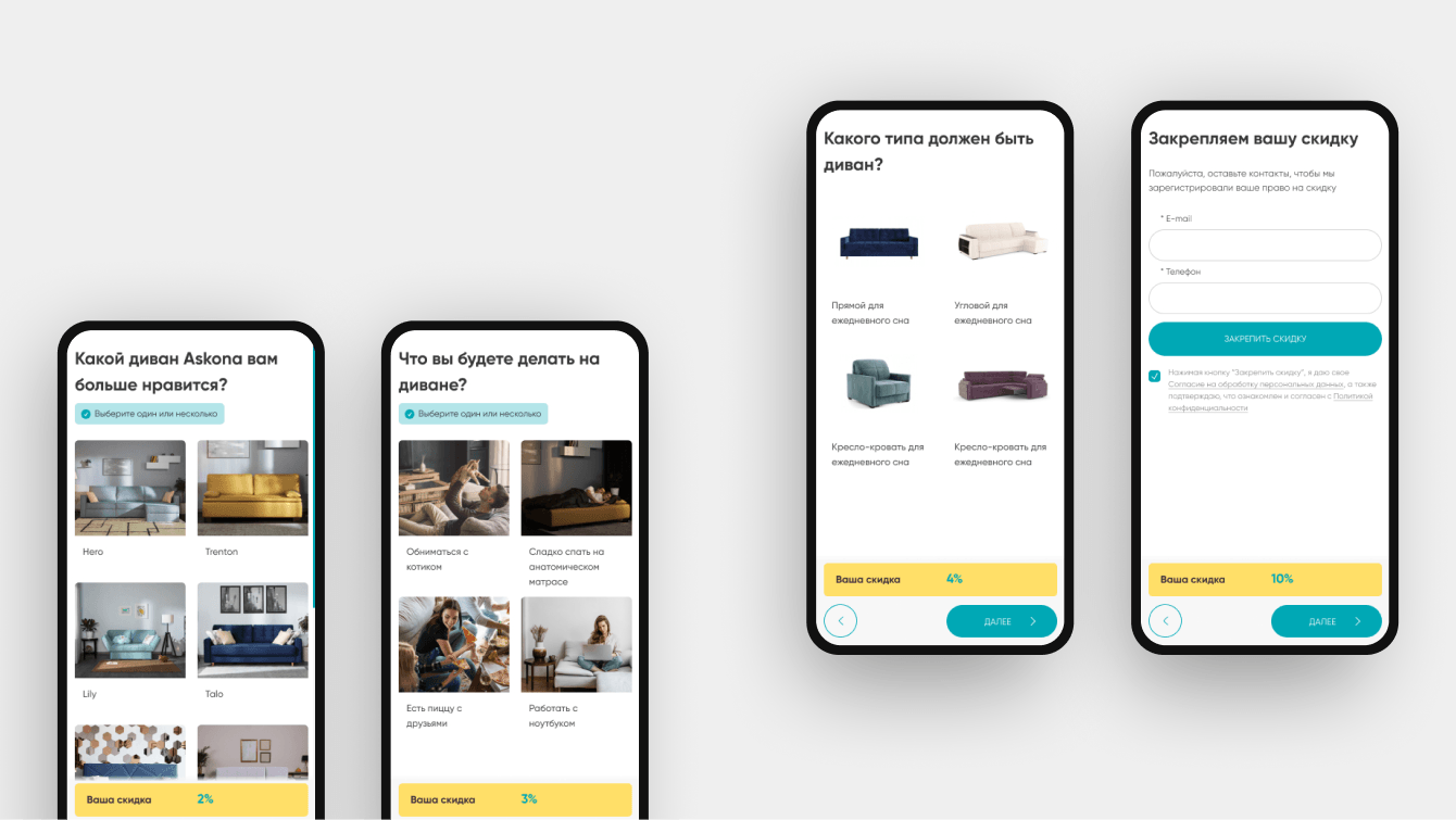 В рамках акции предоставляется скидка на выбранные модели диванов, а также – дополнительная скидка при прохождении специального опроса. Таким образом наш проект решил две задачи: