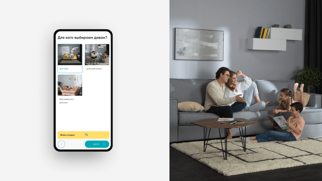 Находясь в любом разделе сайта, пользователь может перейти к квизу. После прохождения опроса он получает подборку подходящих моделей диванов, а также промокод на дополнительную скидку.