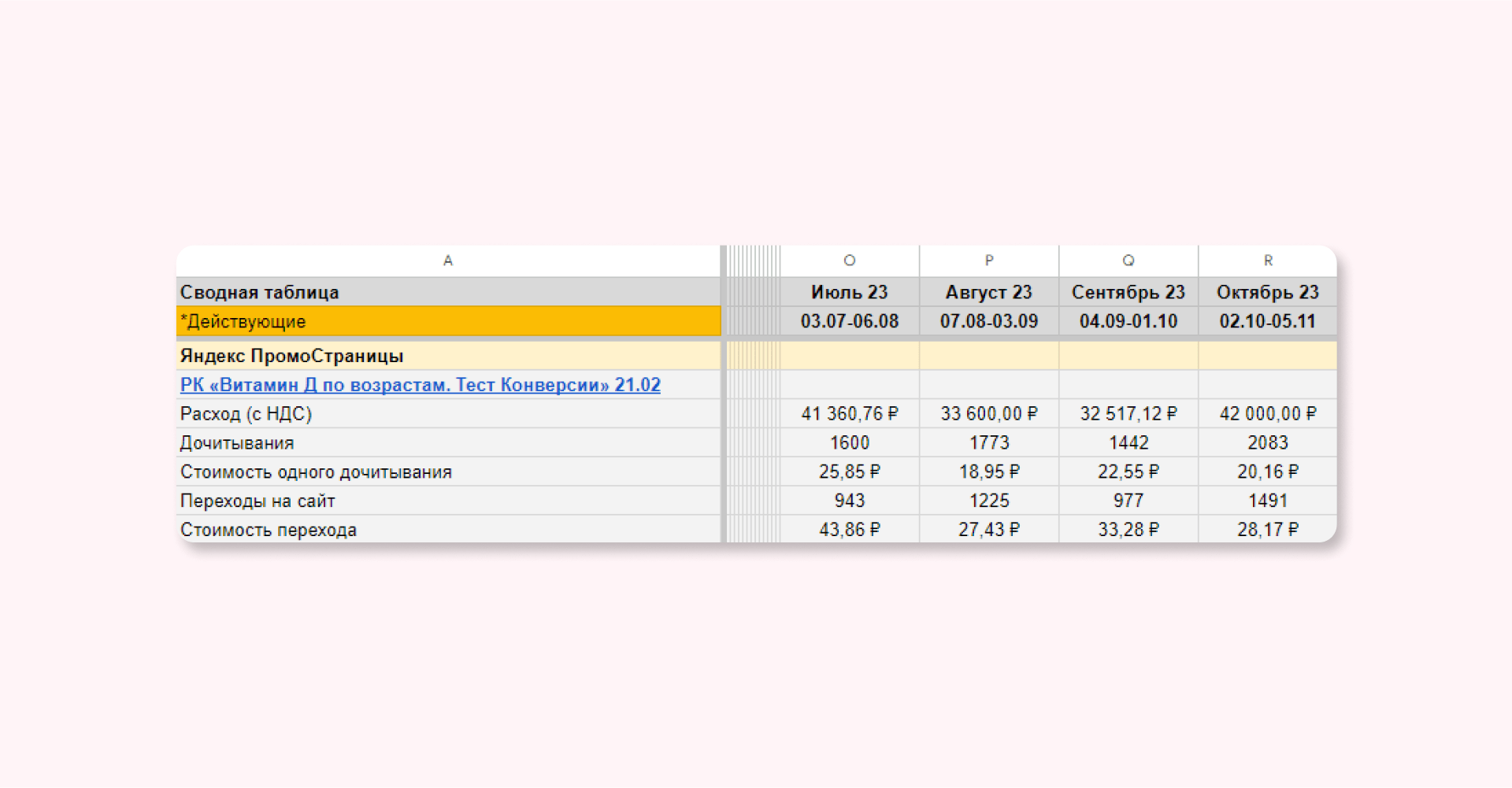 Суммарно мы получили 114 383 перехода на посадочные страницы препаратов по средней цене 23,78 руб., что позволило оценить первый уровень эффективности ПромоСтраниц. Однако мы не остановились на этом.