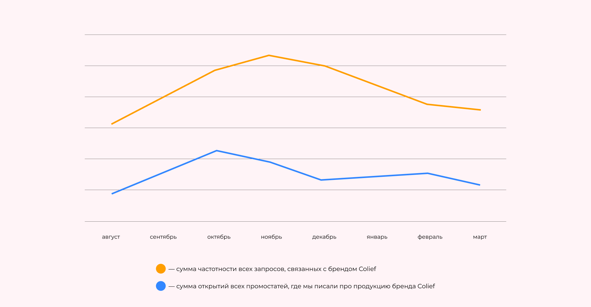 Методика заключалась в сборе данных о частоте запросов, связанных с препаратами бренда Colief, и количестве просмотров ПромоСтраниц. Простыми словами, когда шла активность на ПромоСтраницах, рос интерес пользователей в органике. Когда активность снижалась — снижался и интерес. Таким образом, получилось математически доказать большое и серьёзное влияние ПромоСтраниц на рост интереса к новому на рынке бренду.