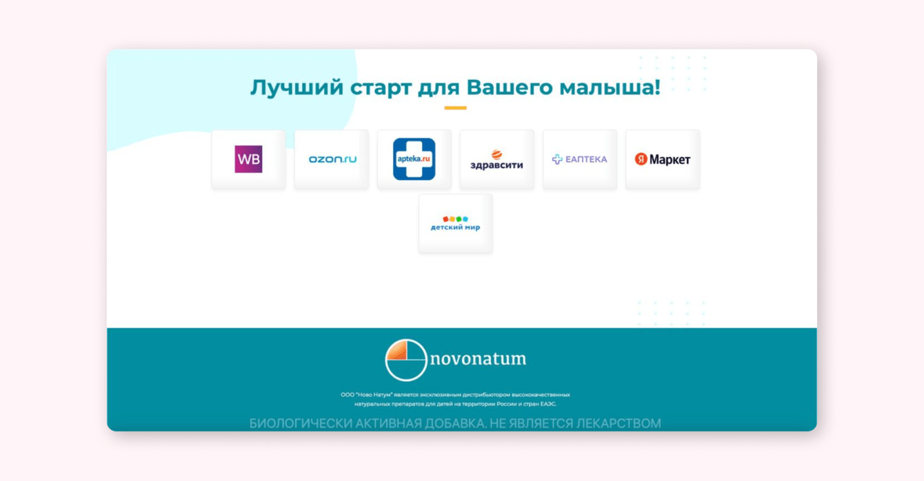 С проектом Novonatum мы направляли трафик с ПромоСтраниц на лендинги с описанием препаратов. Продюсер каждую неделю анализировал качество трафика и конверсии, формируя цепочку касаний: ПромоСтраницы — лендинг — маркетплейс — покупка.