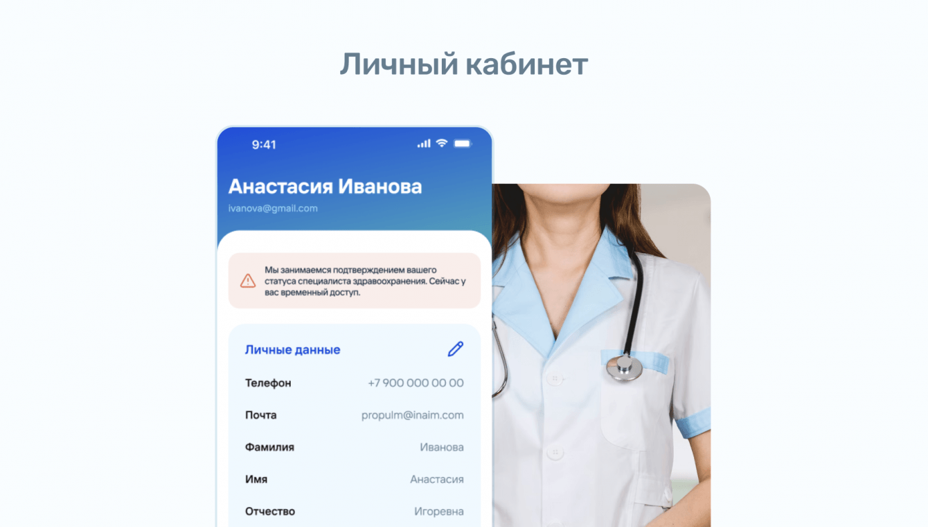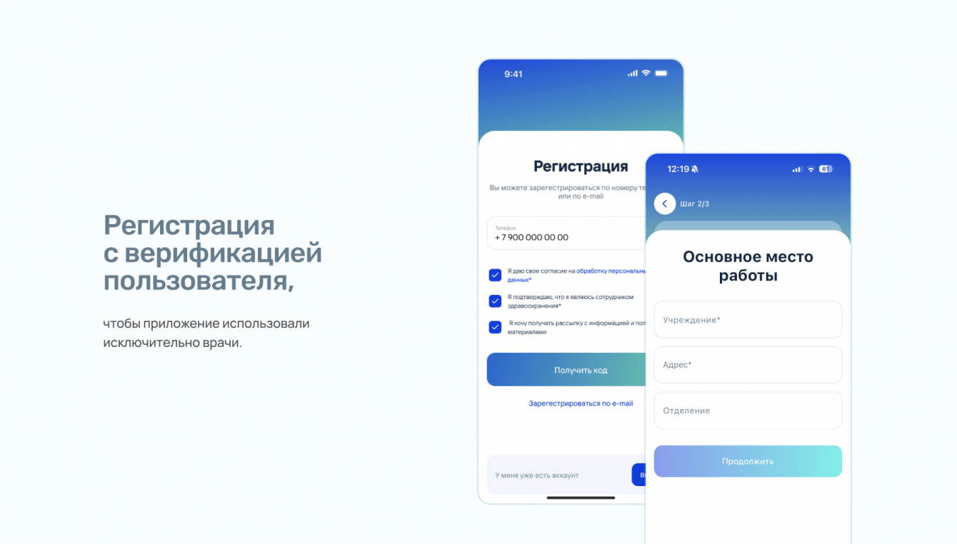 В реализации мы отталкивались от того, что приложение должно быть удобным для врачей разных возрастных категорий с различным опытом взаимодействия с приложениями. Поэтому сделали ставку на лаконичный и понятный дизайн. Мы использовали простые формы и цвета, чтобы не перегружать интерфейс и не отвлекать пользователей от контента.