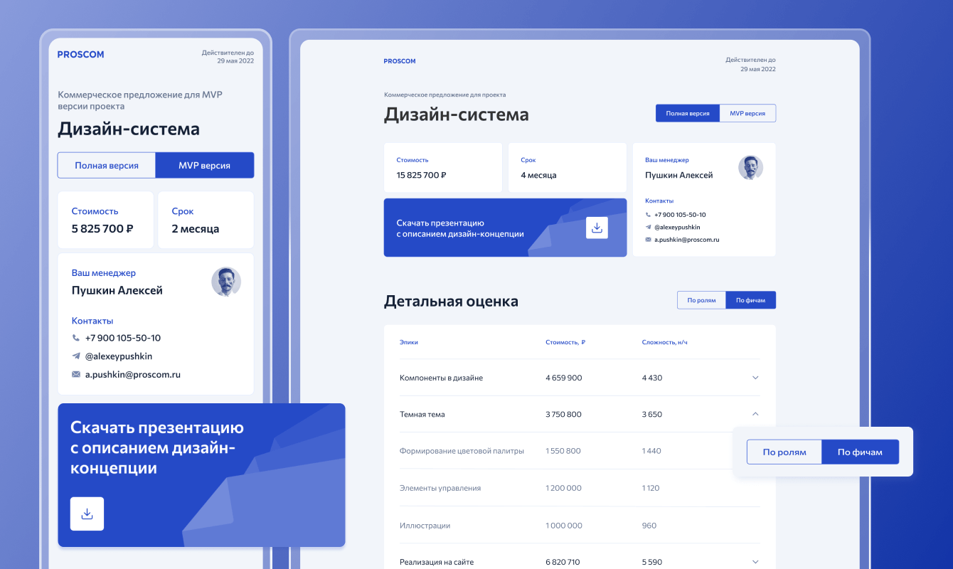 Пройдя по ней, он видит предварительную стоимость, детальную оценку продукта по фичам и по ролям, ориентировочные сроки реализации и контакты менеджера.