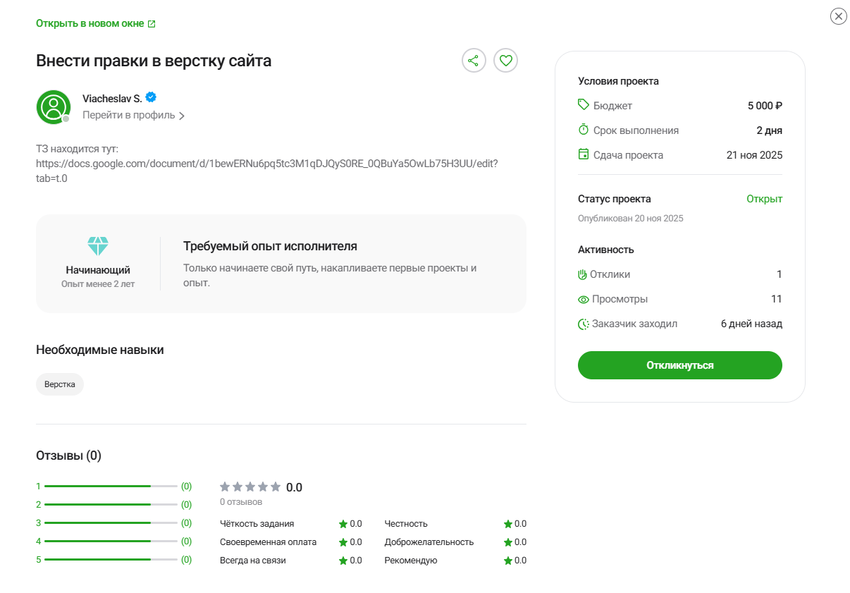 - Гибкий конструктор заказов: заказчик указывает тип (проект / вакансия), бюджет (фиксированный или почасовой), категории, навыки, сроки и описание;