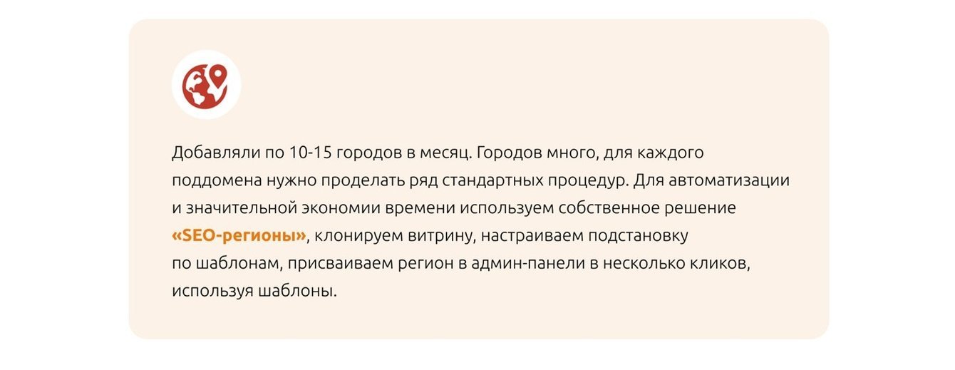 Поддомены создавали поэтапно, по 10-15 за месяц. Для охвата 100 городов нам понадобилось около 8 месяцев.