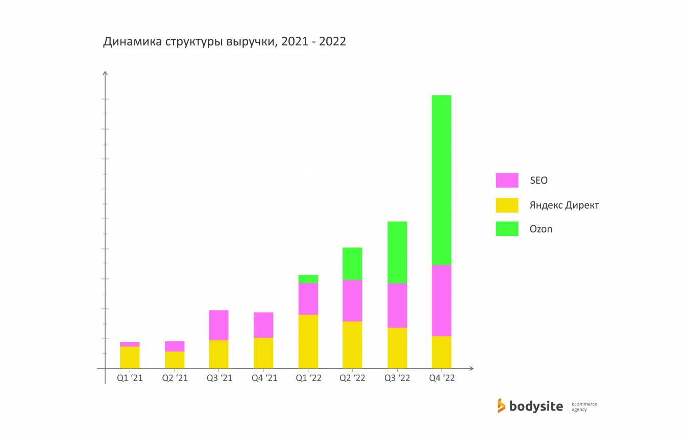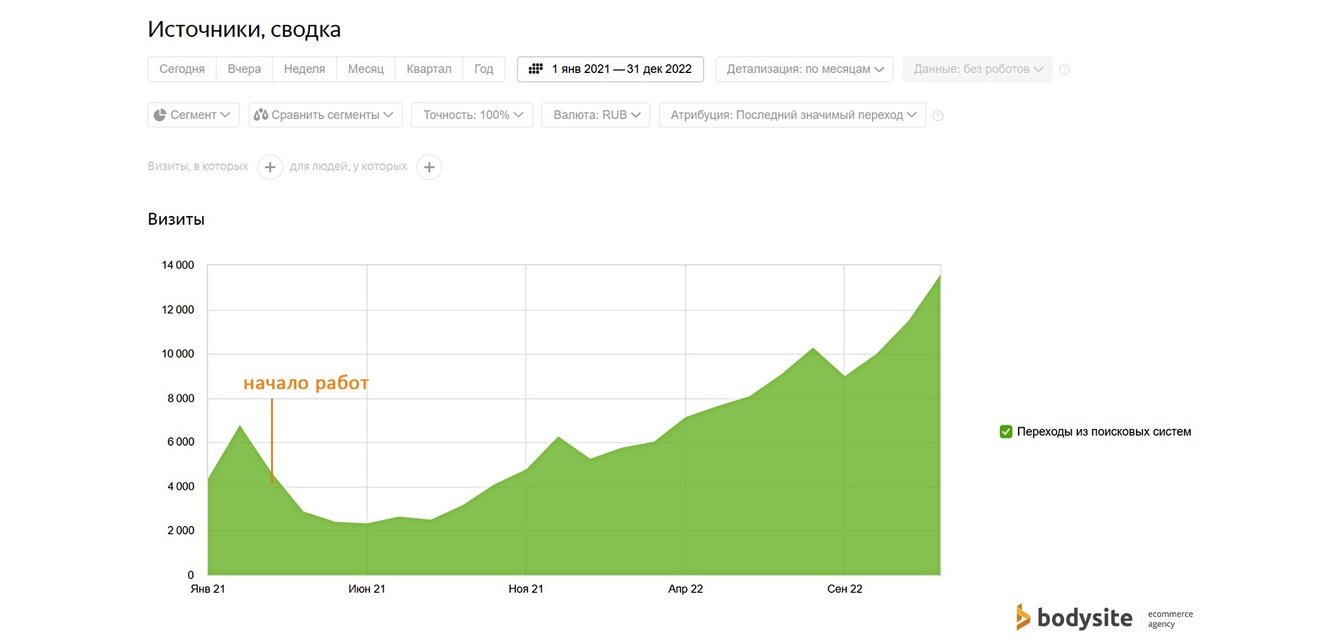 Услуги комплекса мы подключали не одномоментно. Взяли клиента на сопровождение еще в 2021 году — в январе на контекстную рекламу, в марте — на SEO. В 2022 подключили магазин к маркетплейсам.