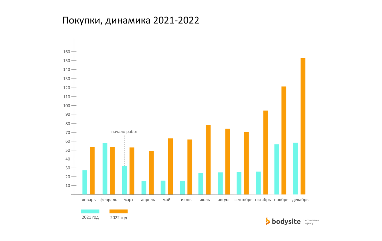 2021: нам удалось увеличить конверсию и количество покупок, причем не только с повторных визитов, но и с первых. Сработала оптимизация стратегий и ставок кампаний в поиске и РСЯ, настройка новых кампаний по условиям ретаргетинга и на Look-alike аудитории.