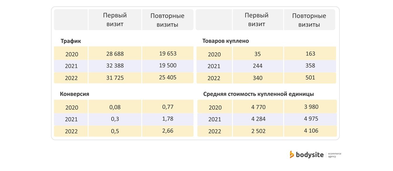 Первую группу показателей анализируем в разрезе первого и повторных визитов, так как нашей задачей было вернуть тех посетителей, кто ушел без покупки. Берем 2020 год, когда клиент вел рекламу самостоятельно, и 2021-2022, когда ведением занимались мы: