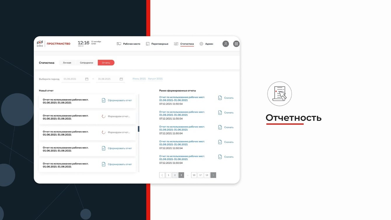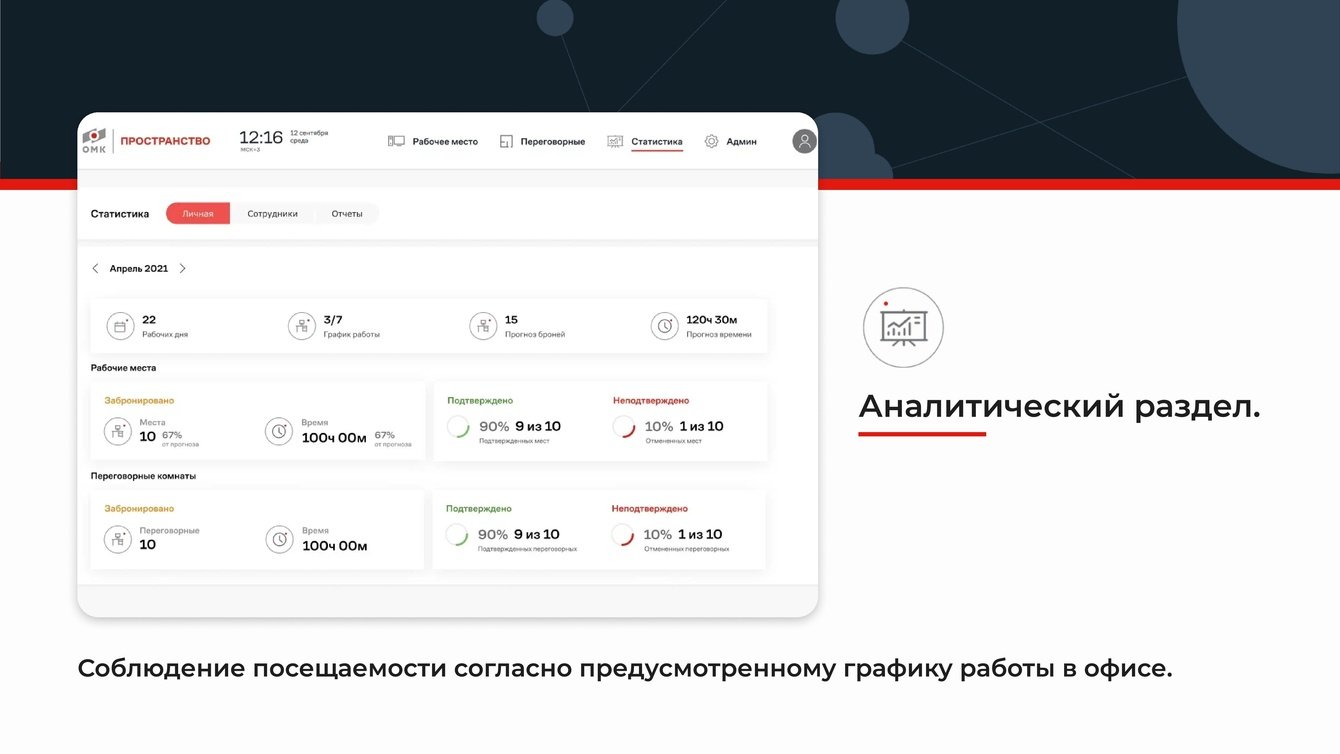 ОМК одной из первых в промышленности внедрила гибридный график работы для офисных сотрудников. Мы предоставили коллегам возможность работать частично или полностью удаленно и ушли от закрепленных рабочих мест в офисах. В связи с этим у нас возникла потребность в сервисе, который позволил бы нашим сотрудникам получать актуальную информацию о доступных рабочих местах и резервировать их для краткосрочного использования, а нам - оценить загрузку и востребованность рабочих мест, чтобы оптимизировать свои затраты на аренду офисных помещений. Готовые решения, которые представлены на рынке, не отвечали всем нашим требованиям: что-то было внедрять долго, что-то - сложно интегрировать с нашими информационными системами. Команда ОМК под руководством Артема Гребенюка в сжатые сроки разработала сервис «ОМК Пространство» с понятным интерфейсом, в котором учтены как лучшие практики на рынке, так и особенности нашей работы.