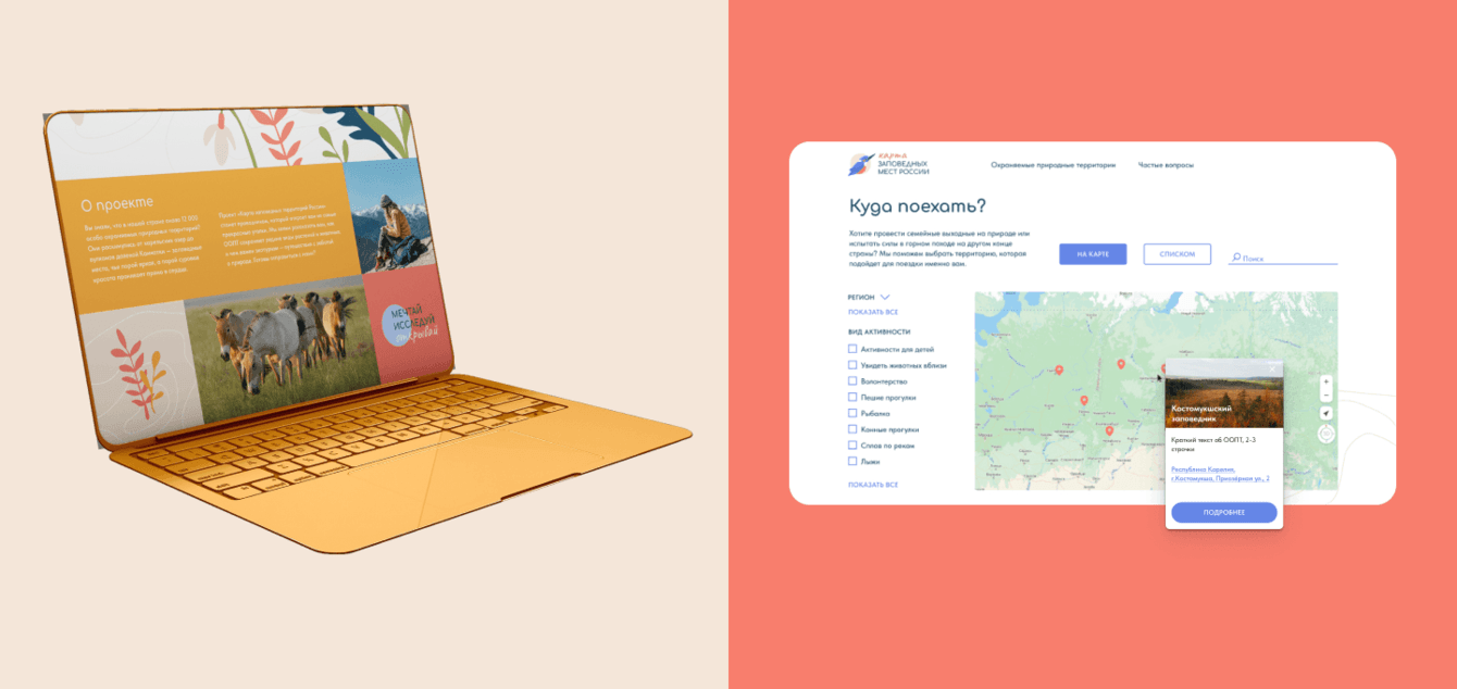 Чтобы познакомить аудиторию с заповедным миром и помочь подобрать территорию для путешествия, мы разработали сайт с интерактивной картой ООПТ России.