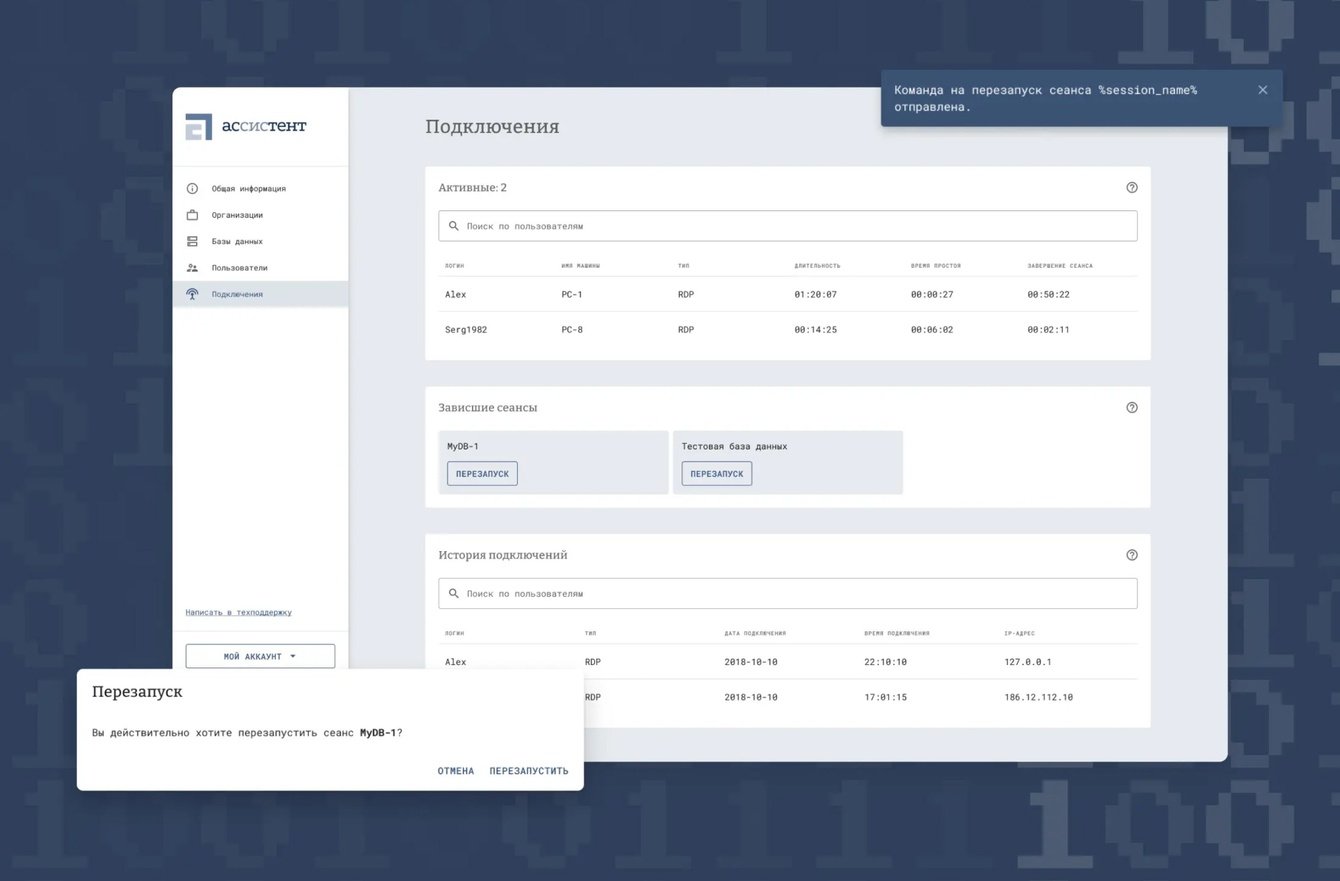 У баз отображается текущий статус подключения. В отдельном разделе Подключения отображаются текущие сеансы, которые можно перезапустить вручную. Есть история подключений к базе, хранится в течение 30 дней.