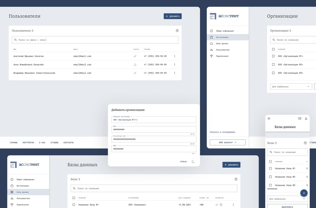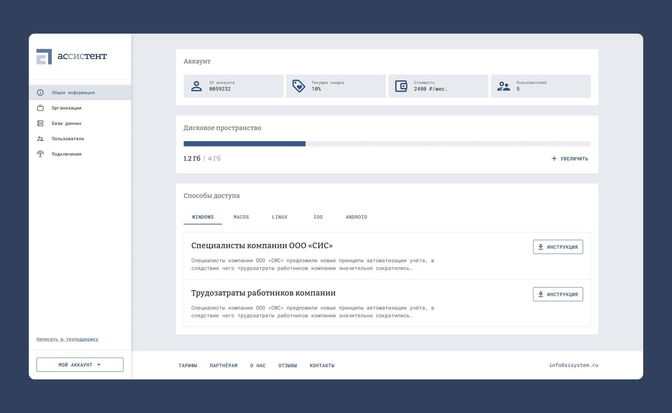 В личном кабинете клиента создаются организации и сотрудники. Можно создать базу данных, выбрать нужную конфигурацию, квоту и привязать базу к компании.