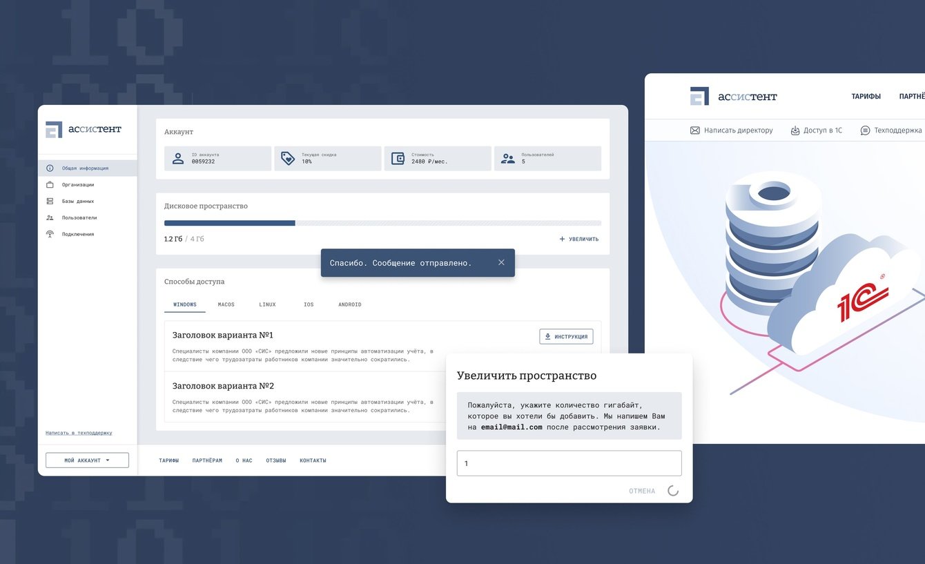 Личный кабинет для управления базами данных 1С. Компании регистрируются, выбирают базы нужной конфигурации и получают к ним доступ удалённо, после оплаты тарифа.