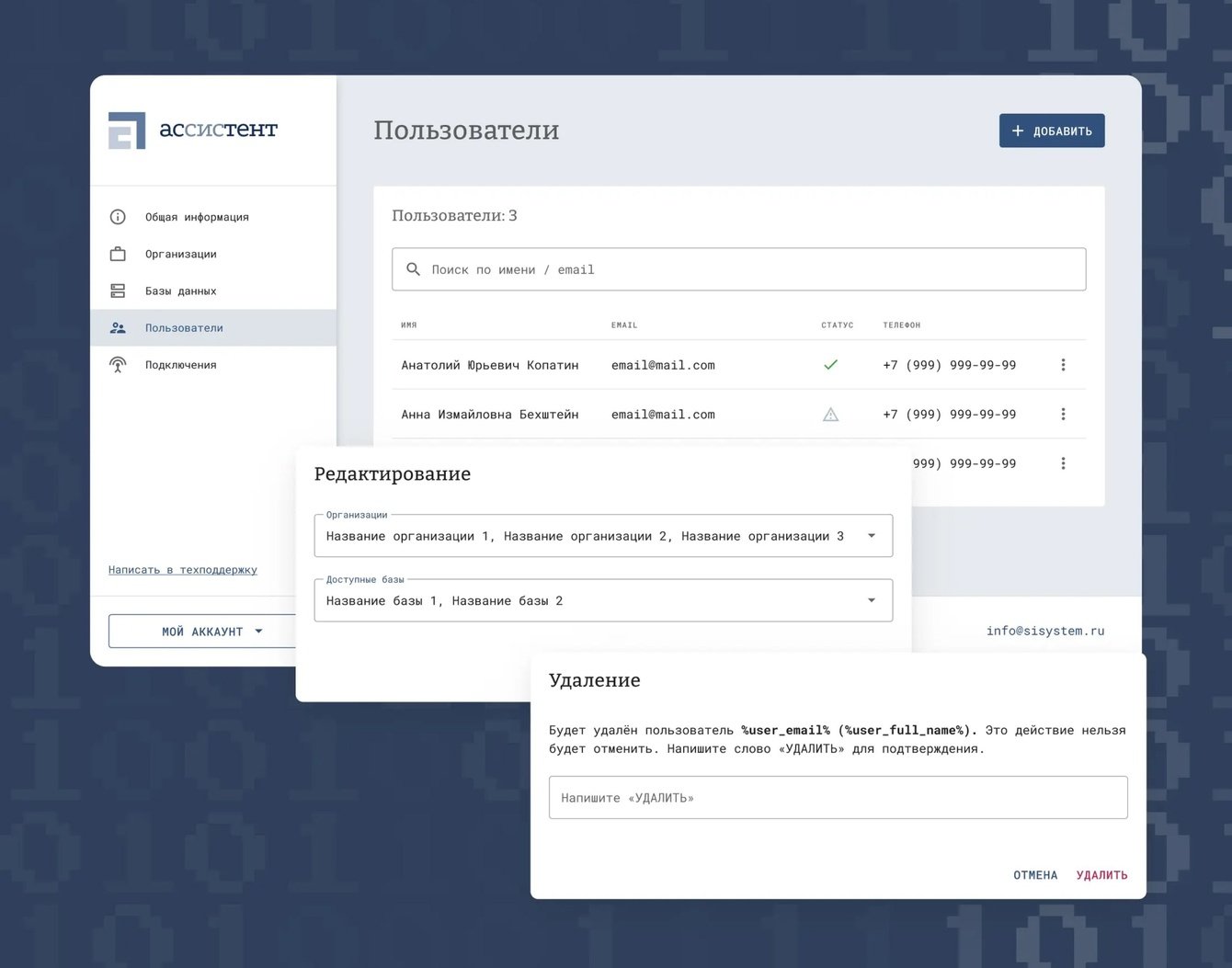 В настройках редактируются пользователи базы с правами на чтение и редактирование. Есть опция автообновления базы и массовые операции.