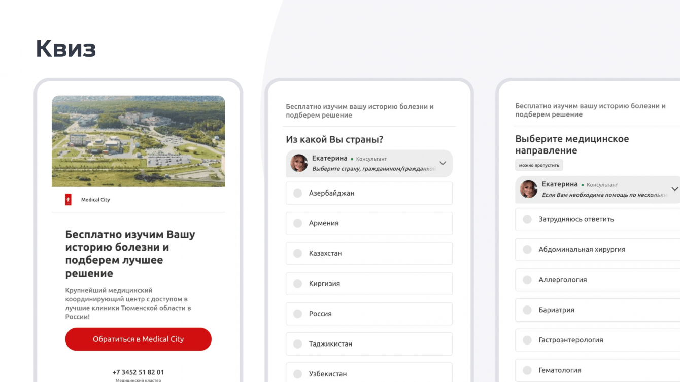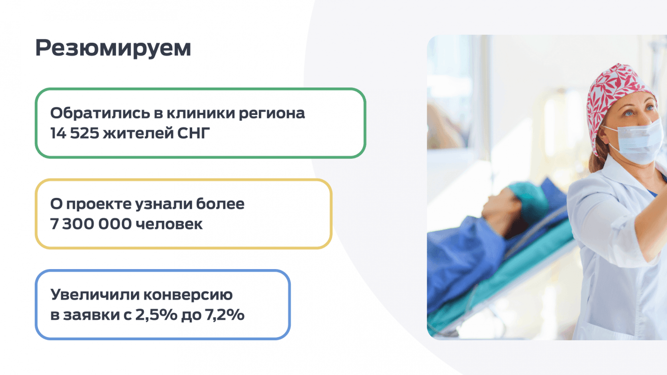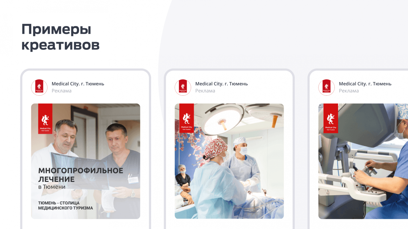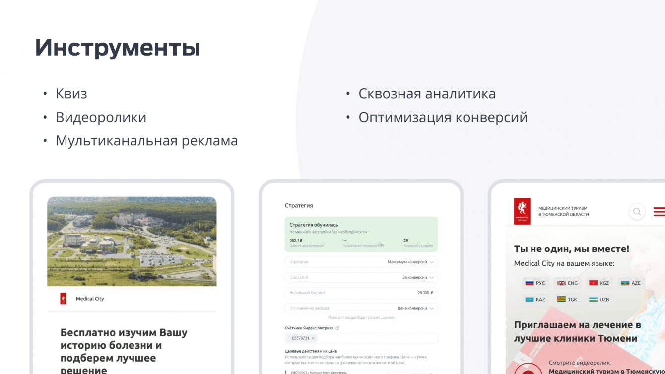 В рамках Федерального проекта «Развитие экспорта медицинских услуг» организовать поток обращений в центр медицинского туризма города Тюмень согласно условиям контракта. Цель контракта - обеспечить высокие охваты жителей стран СНГ, проработать и реализовать стратегию повышения узнаваемости бренда, выполнить обозначенные в контракте KPI по количеству обращений из стран СНГ, а также увеличить конверсию площадок проекта: сайта и сообществ в социальных сетях.