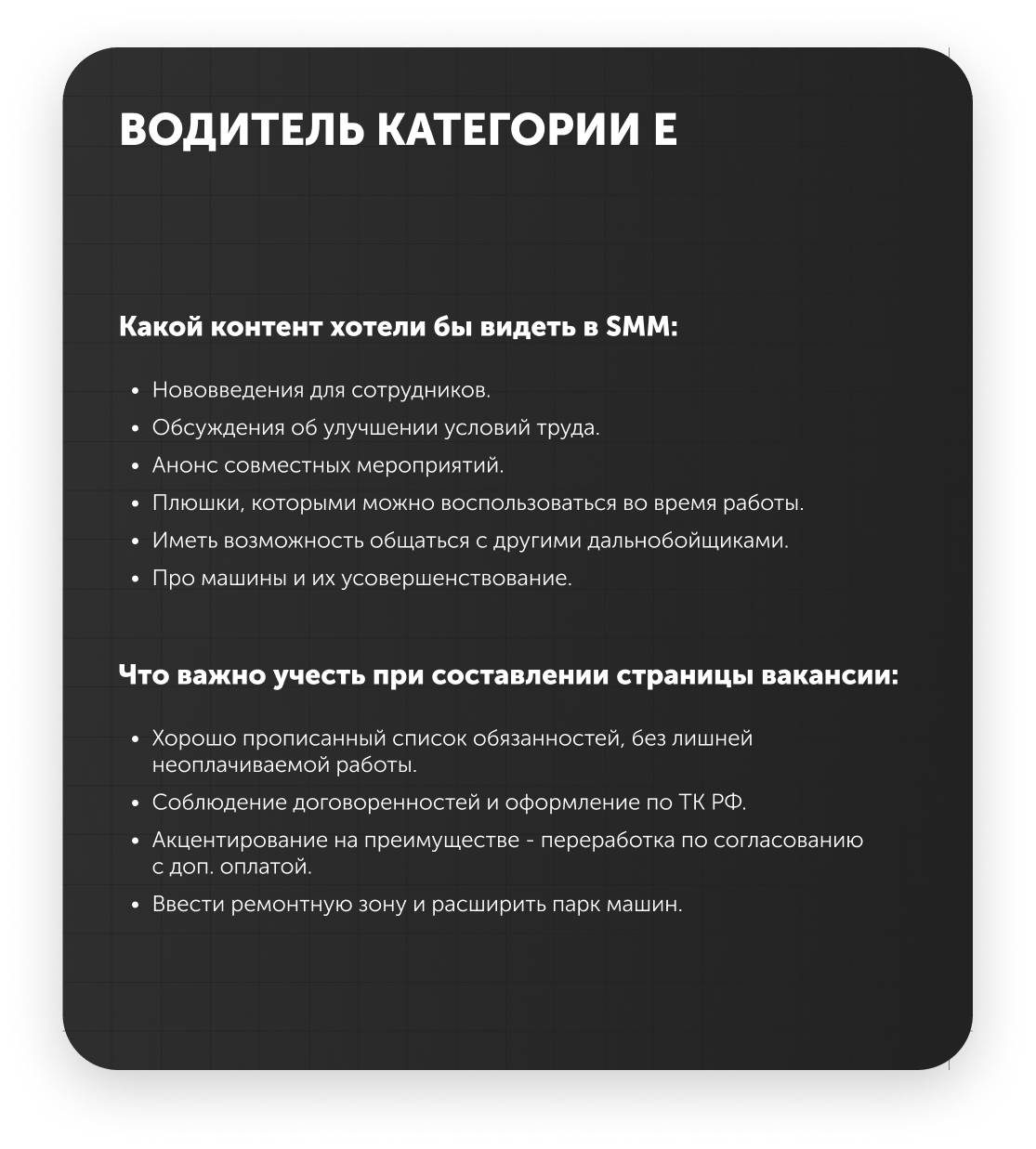 Провели глубокий анализ целевой аудитории для каждой вакансии: грузчик, водители разных категорий, бригадир, приемосдатчик и др.