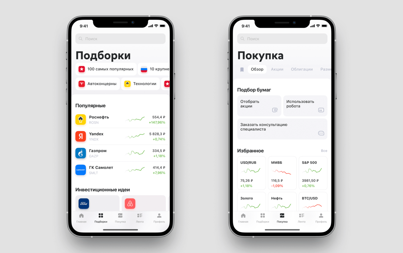 Подборки и покупки — подборки помогут выбрать, что нужно. Это идеи для инвестиций, которыми можно воспользоваться. В разделе с покупками реализовали механизм сортировки, фильтрации, дивидендный календарь.