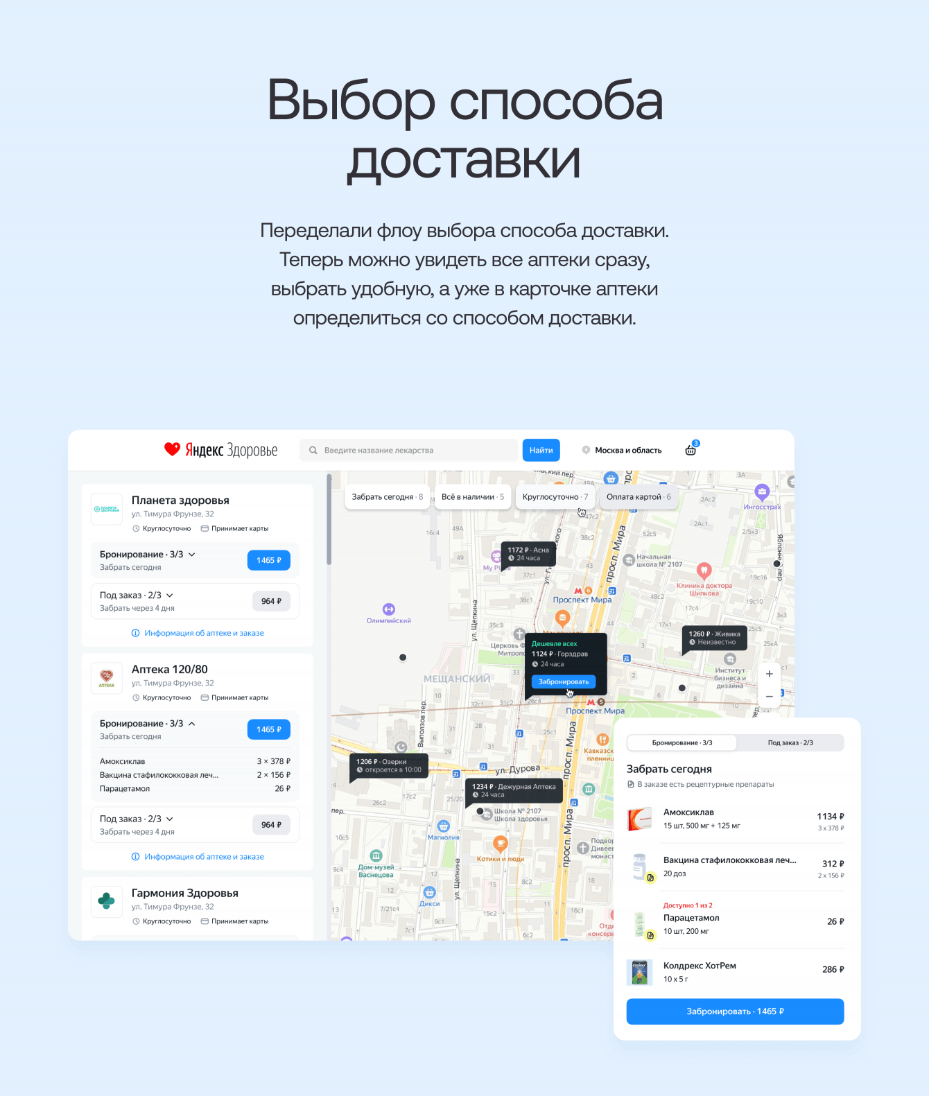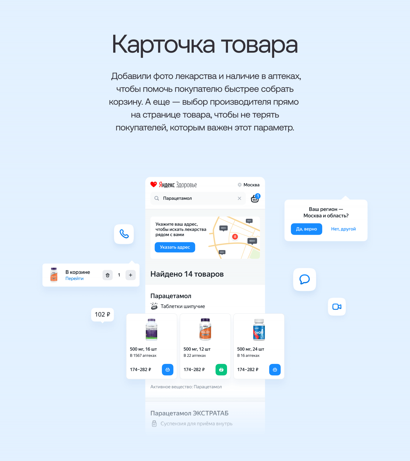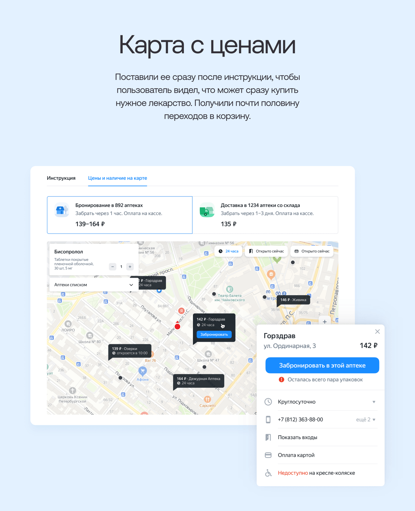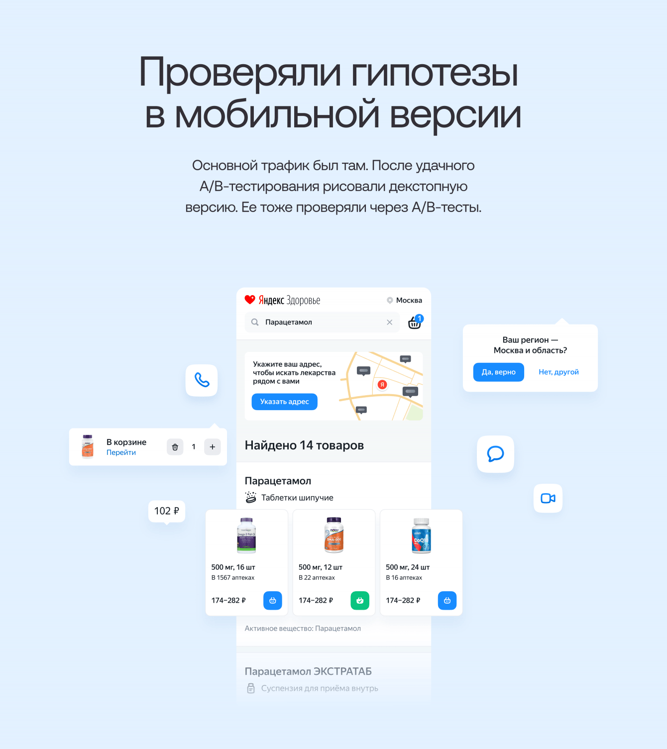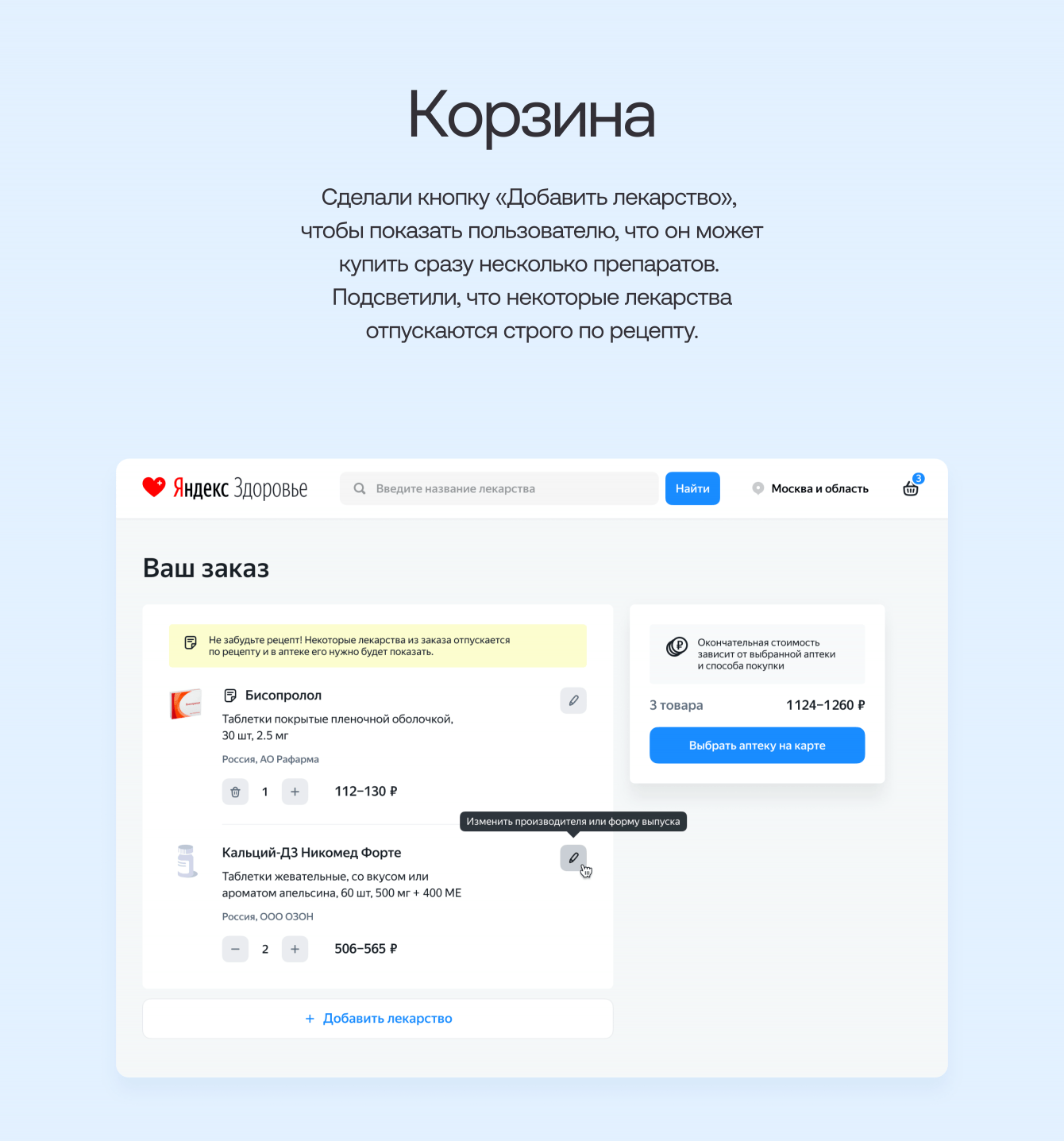 Так у клиента появилась гипотеза, что этих пользователей можно превратить в покупателей лекарств. Для этого нужно было добавить флоу покупки лекарств и выбора аптеки прямо в Яндекс Здоровье.