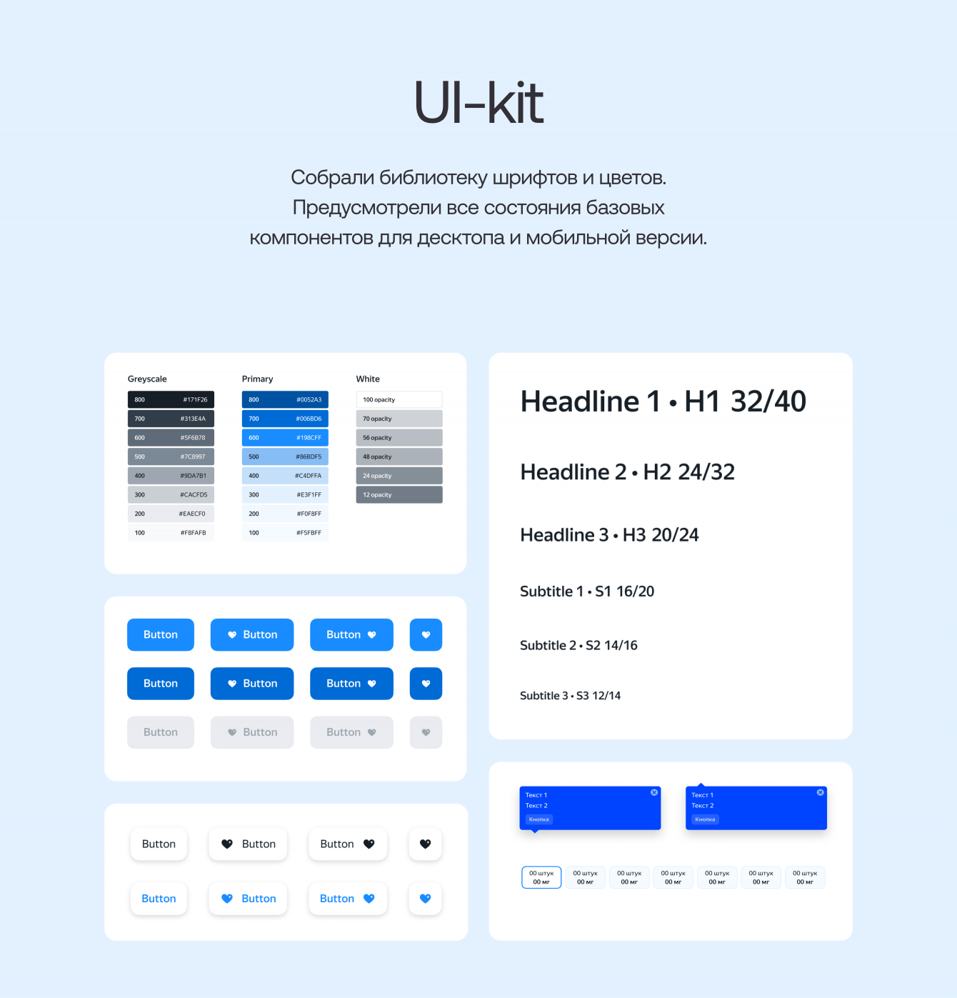 Сервис уже работал, поэтому мы решили опираться на текущий стиль элементов. Многое приходилось придумывать, так как существующие стили не всегда справлялись с поставленной задачей. Например, в дизайне был активный цвет, но не было цвета при наведении. Или был стиль заголовка, но не было стиля заголовка второго уровня. Так что мы проработали типографику, выбрали цвета и нарисовали пиктограммы. Собрали все в UI-kit для удобства команды.
