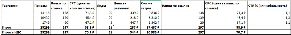 Мы создали несколько целевых аудиторий, разработали макеты баннеров и тексты. Рекламный бюджет — примерно 20 000 рублей (остальное пошло на маркетинг и дизайн).