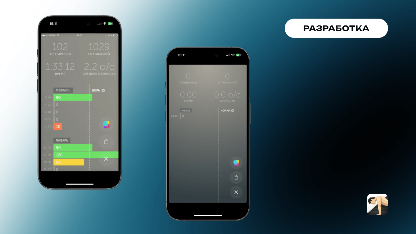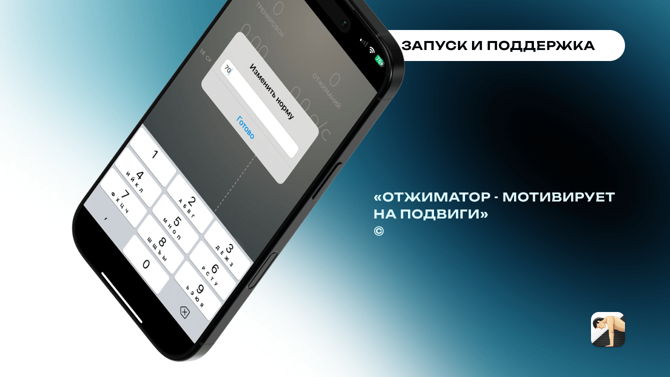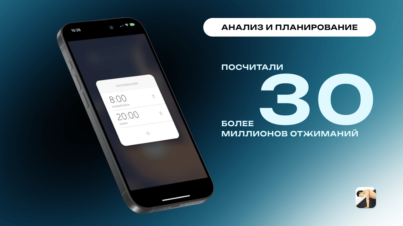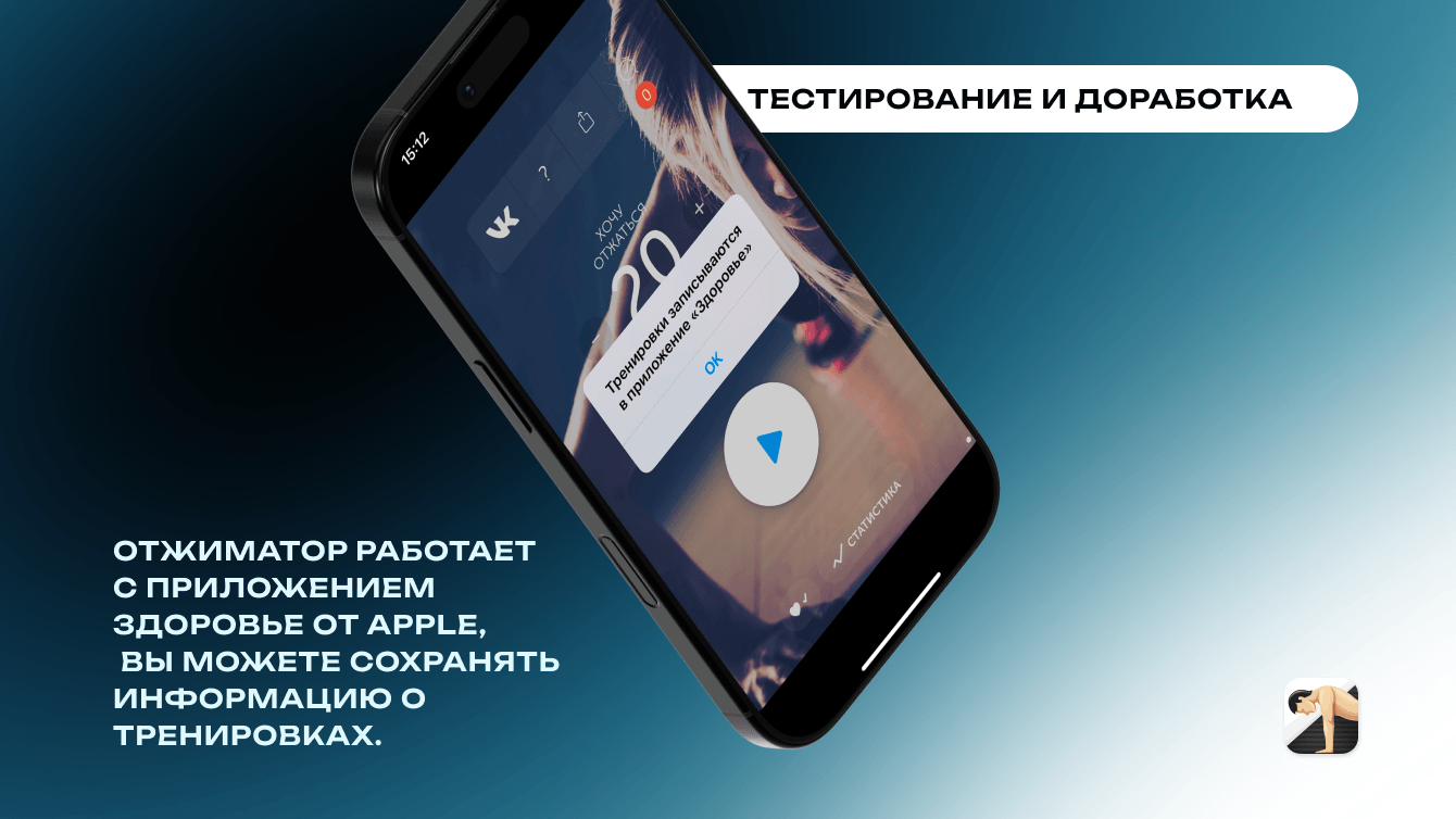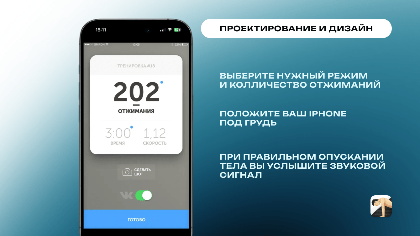 - Составлено техническое задание с акцентом на сенсорное отслеживание отжиманий, графики и интеграцию с Apple Health.