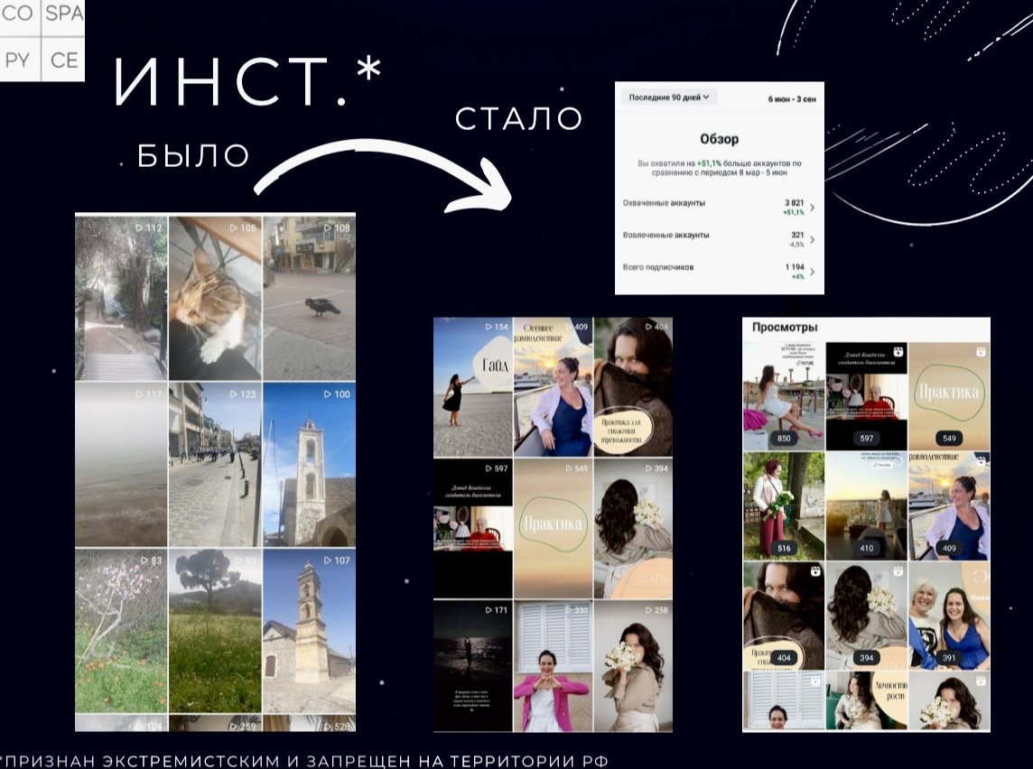 Первым что мы сделали в создании контента - это задали себе вопрос «Чтобы хотели читать и узнавать люди?» . Далее мы создали собственный стиль для Ирины и ее аккаунта , который начал нравится и привлекать подписчиков . Подготовили с нуля контент план , которого придерживались и дали аккаунту новую жизнь .