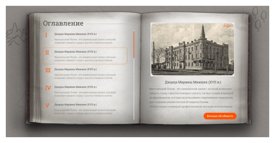 Мы собрали в одном месте все объекты, над которыми работала команда Дарьи Калугиной, предоставили пользователям удобную площадку для изучения исторических зданий Пскова и погружения в атмосферу старины. О проекте и в том числе о сайте рассказали в телевизионном репортаже.