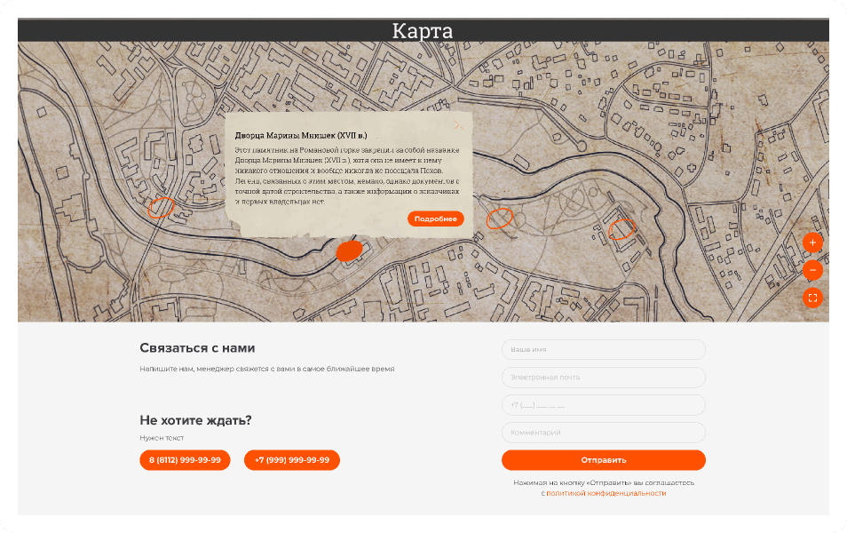 - Не стали использовать классическую Яндекс Карту на главной странице, а продолжили в духе старины и отрисовали древнюю карту Пскова сами, а на ней отметили расположение исторических объектов.