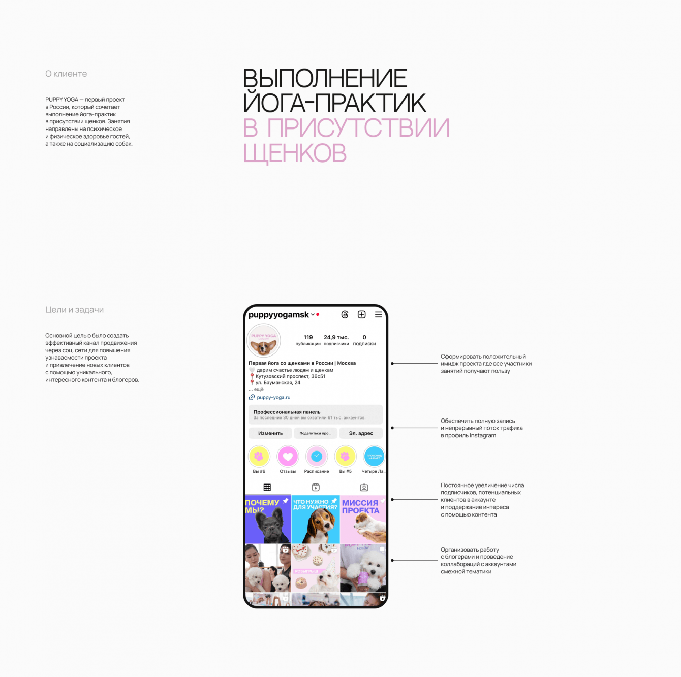 Основной целью было создать эффективный канал продвижения через соц. сети для повышения узнаваемости проекта и привлечение новых клиентов с помощью уникального, интересного контента и блогеров.