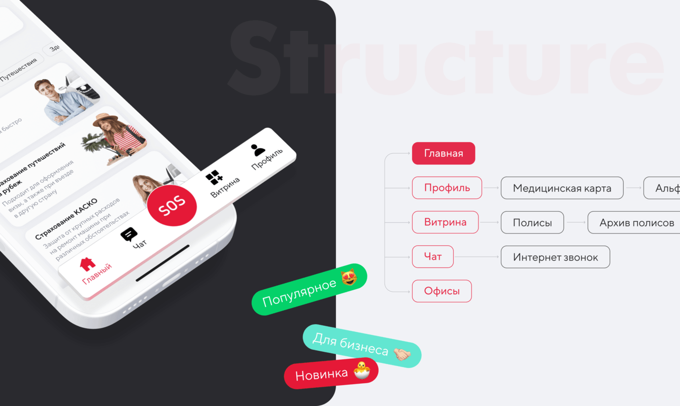 На главном экране расположено меню, офисы, сторис, вся информация и возможность сообщить о страховом случае по кнопке SOS.