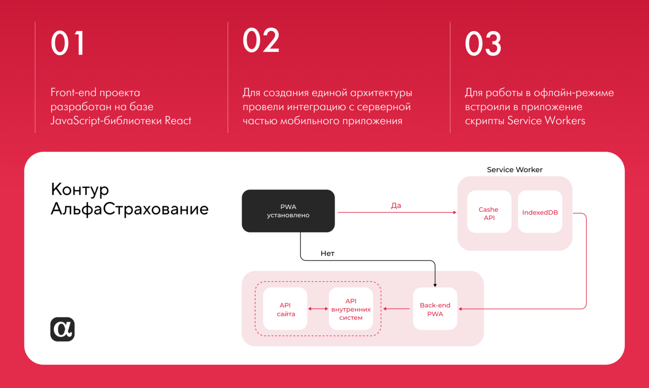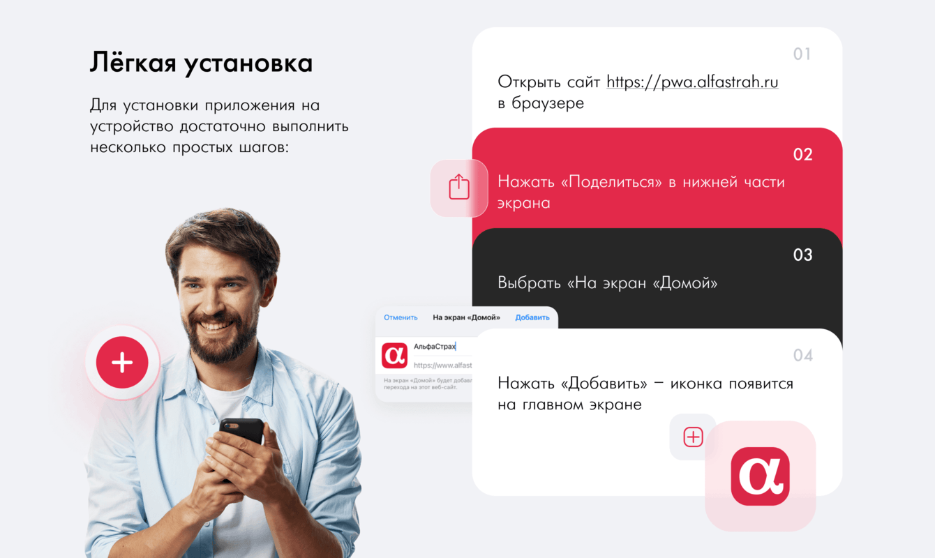PWA-приложение «АльфаСтрахование» разработано с целью увеличения каналов дистрибуции мобильного приложения, что позволило быть независимым от иностранных магазинов приложений. PWA обеспечивает устойчивость к возможному удалению.