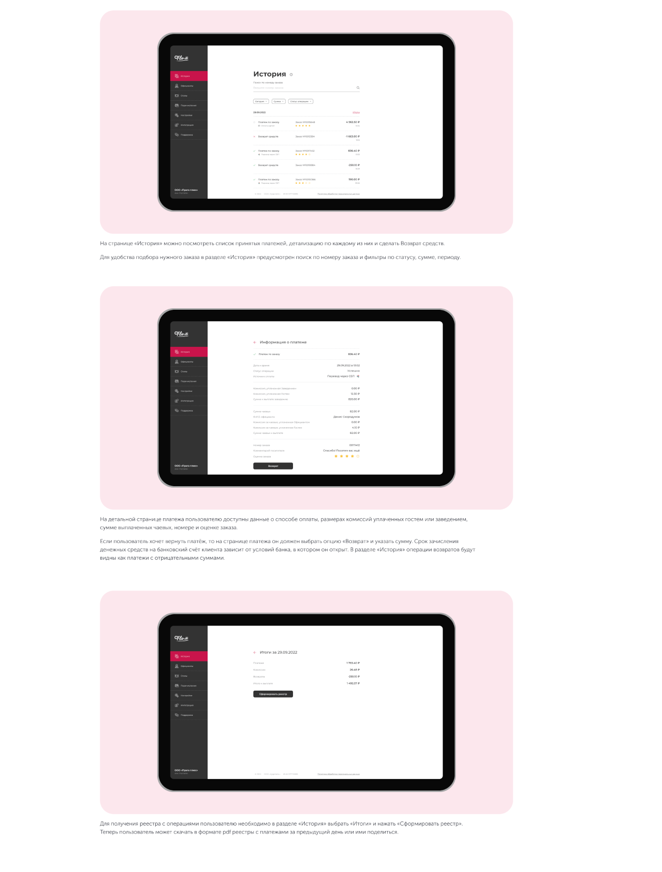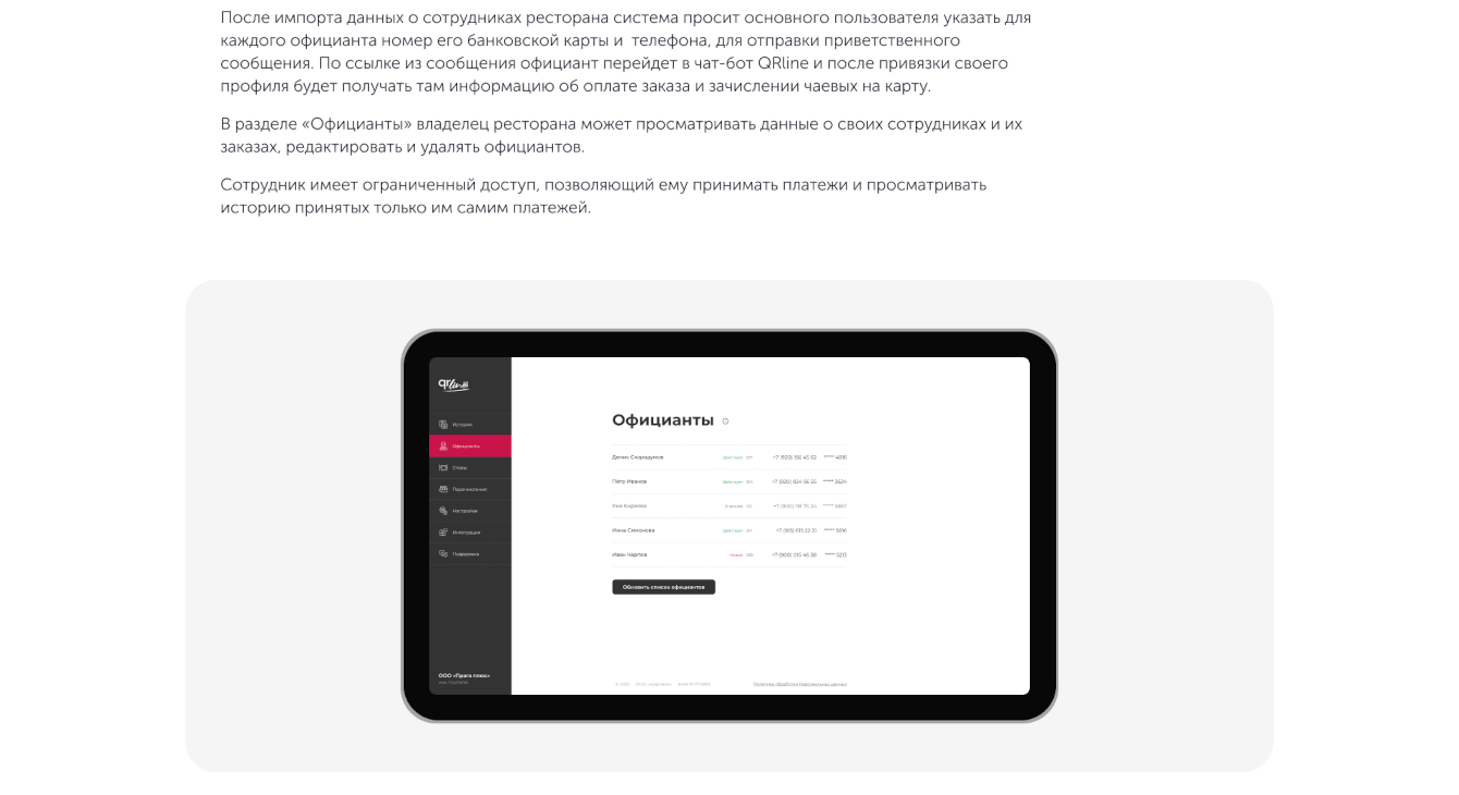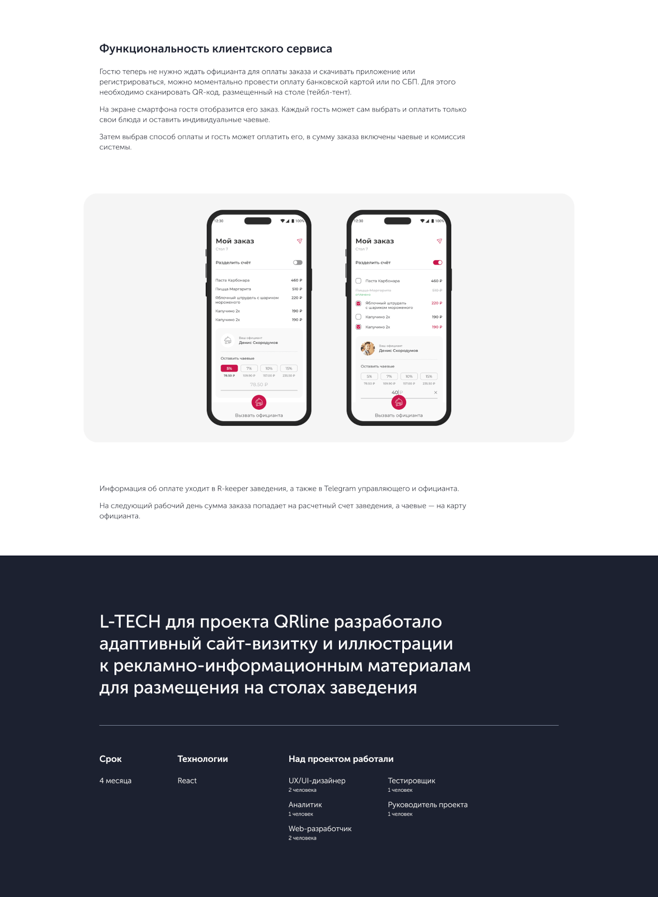 Разработать клиентский сервис безналичных чаевых и самостоятельной оплаты счёта, web-приложение для владельцев и сотрудников кафе и ресторанов, сайт-визитку c преимуществами и инструкциями к сервису.