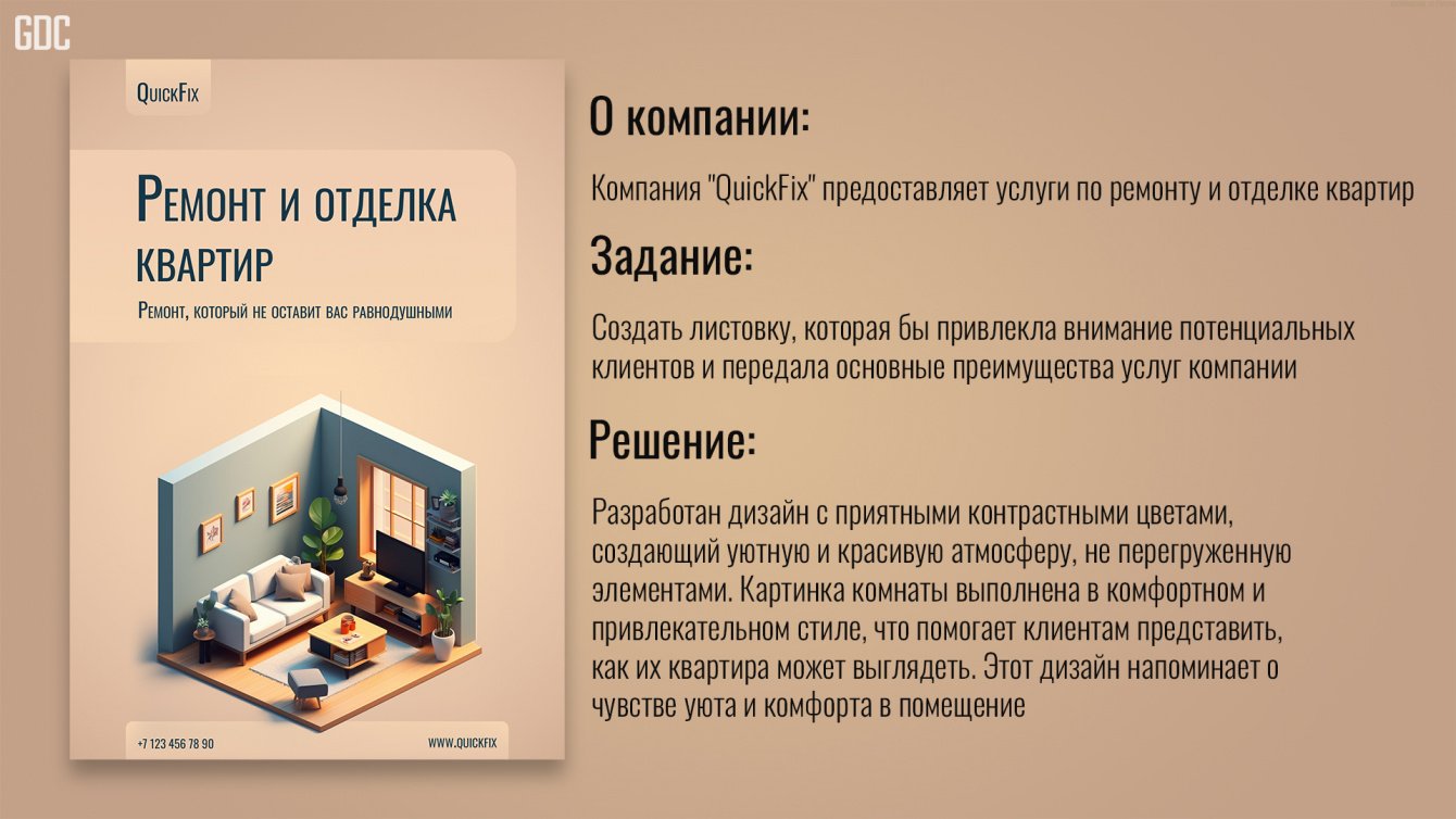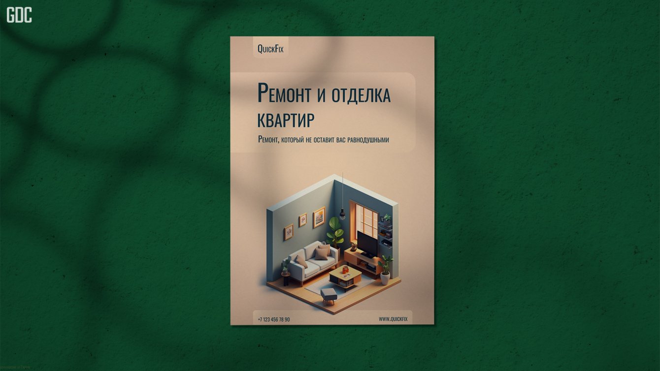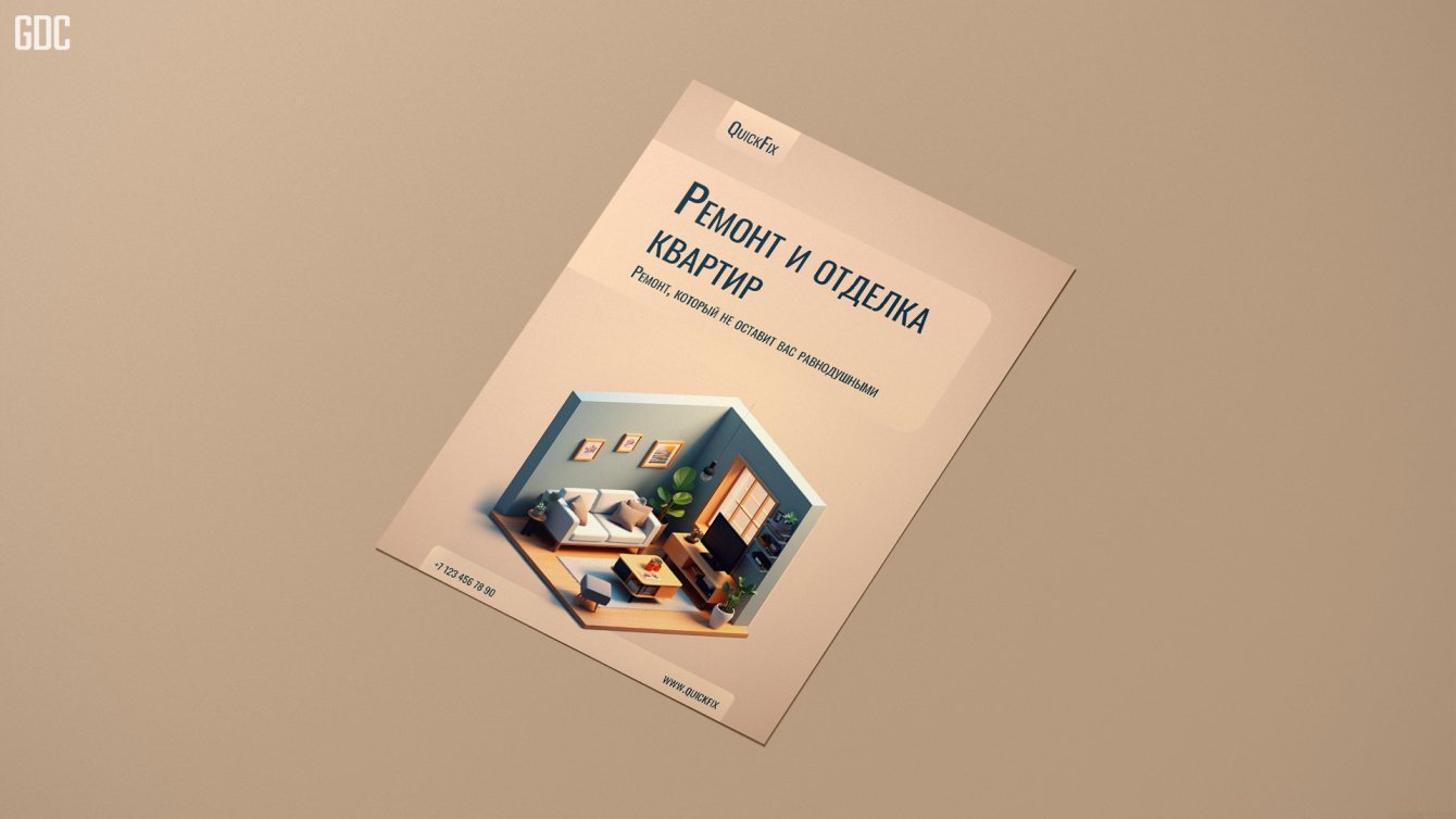 О компании: Компания "QuickFix" предоставляет услуги по ремонту и отделке квартир Задание: Создать листовку, которая бы привлекла внимание потенциальных клиентов и передала основные преимущества услуг компании