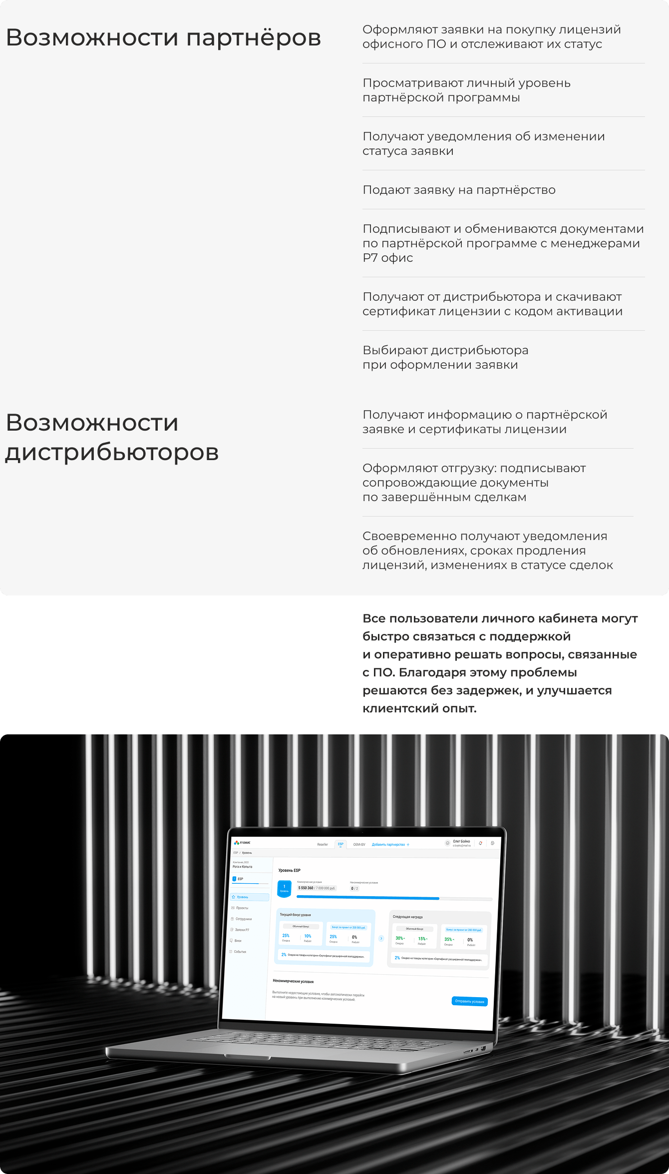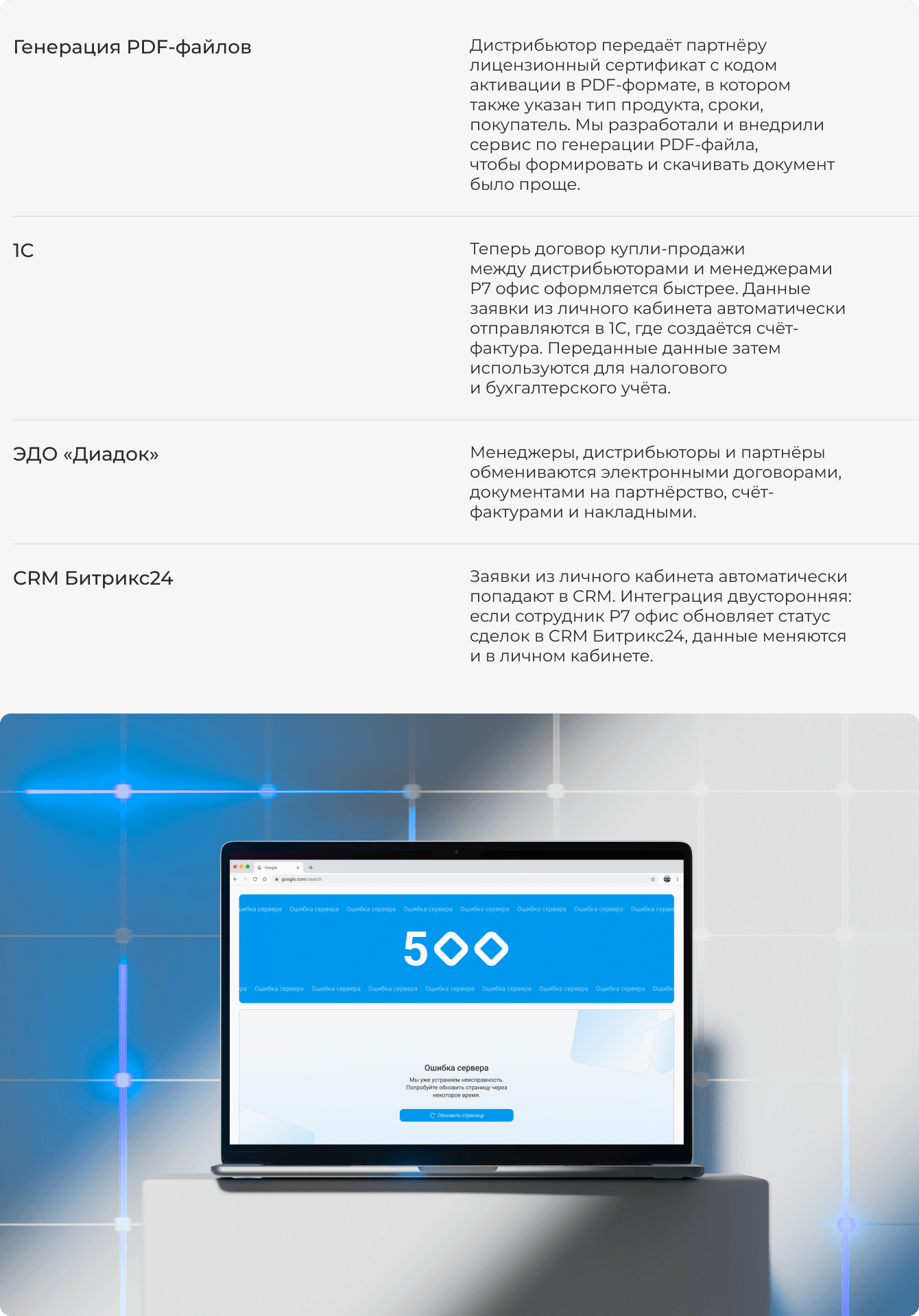 Чтобы оптимизировать работу с дистрибьюторами и партнёрами, эффективнее управлять поступающими заявками, Р7-Офис обратились к нам за разработкой личного кабинета.