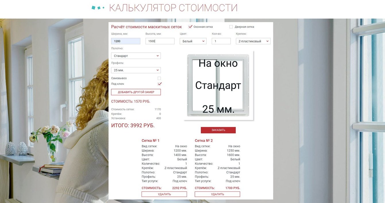 Главной изюминкой сайта является калькулятор стоимости изготовления и монтажа москитных сеток. Его функциональность позволяет для каждого пользователя индивидуально рассчитать стоимость изделия и услуг.