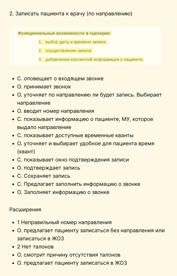 2. Описали основные сценарии работы сотрудника службы записи к врачу.