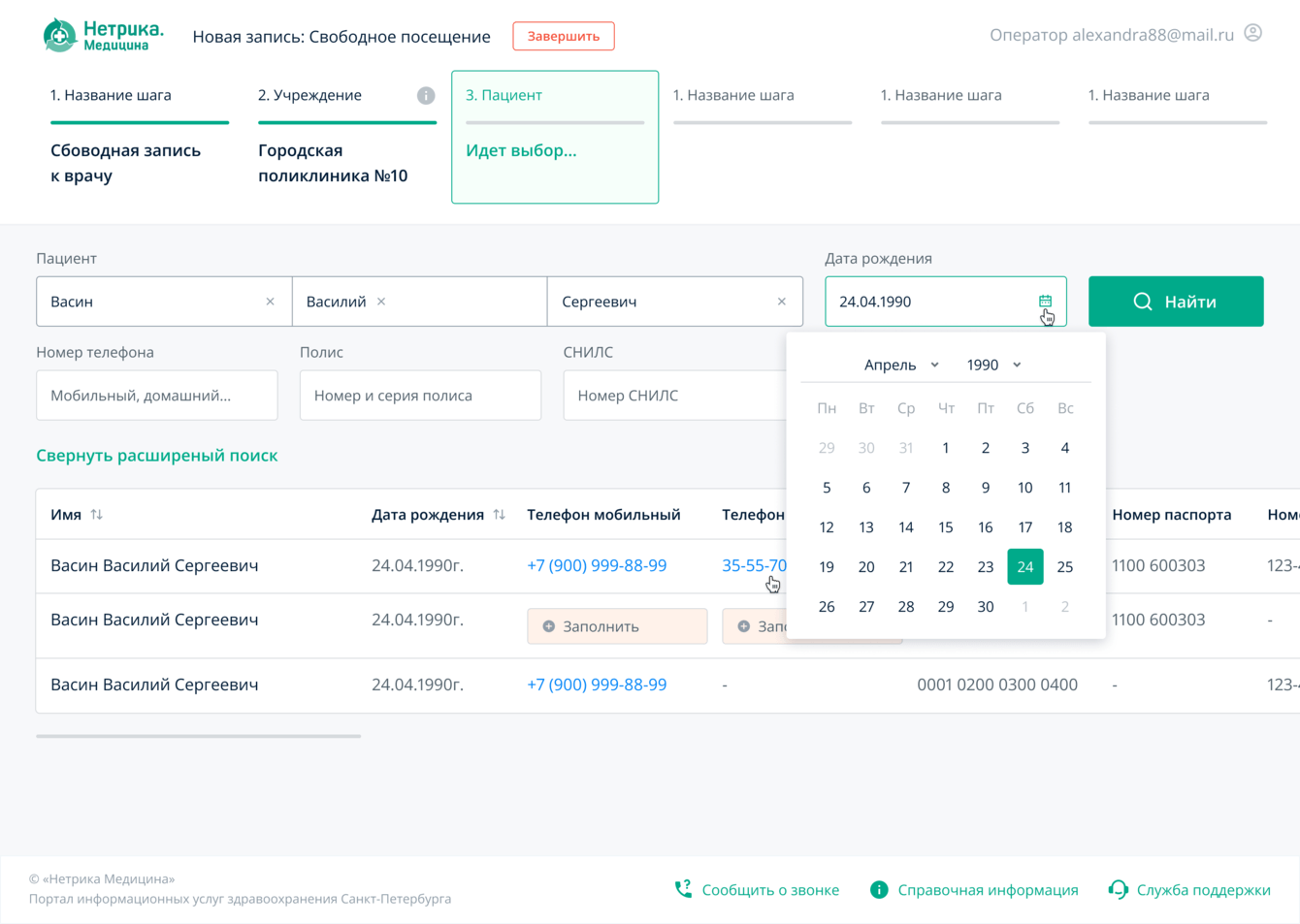 Один из продуктов компании — рабочее место сотрудника операторов службы записи к врачу. Во времена ковида нагрузка на медицинские колл-центры заметно возрасла, и заказчик обратился к нам за новыми интерфейсами.
