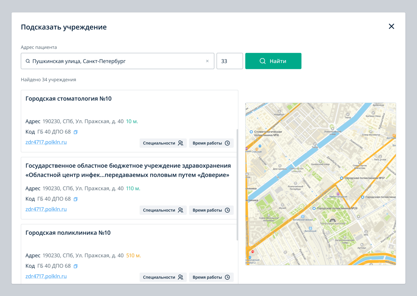 - Помочь пациенту найти медучреждение, узнать расписание его работы и т.п.