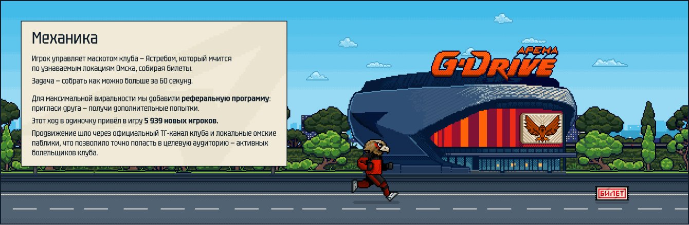 Работа TRIBE над игрой к старту продаж абонементов прошла отлично. Мы хотели не просто сообщить о старте продаж, а дать болельщикам что-то интересное, и у TRIBE получилось это сделать через игру в Telegram. Больше всего понравилось, как в игру интегрировали реальные локации Омска: G-Drive Арена, Клиентский центр, Хоккейная Академия и даже партнерская АЗС «Газпромнефть». Узнаваемые места создавали полное погружение, а механика, похожая на Mario, где нужно собирать шайбы, была простой и азартной.