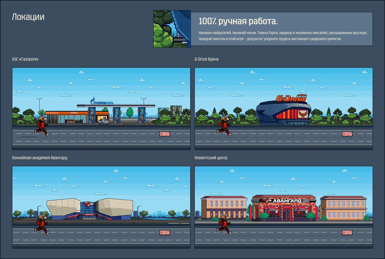 Визуальная часть – сердце этого проекта. Мы отказались от генерации графики, каждая из 5 локаций была отрисована вручную цифровым художником. Мы выбрали узнаваемые места Омска, связанные с клубом и его спонсором: стадион «Авангард», G-Drive Арену, заправки «Газпромнефть». Это создавало у игроков из Омска эффект узнавания и погружения в родной город, а у иногородних болельщиков — ощущение причастности.