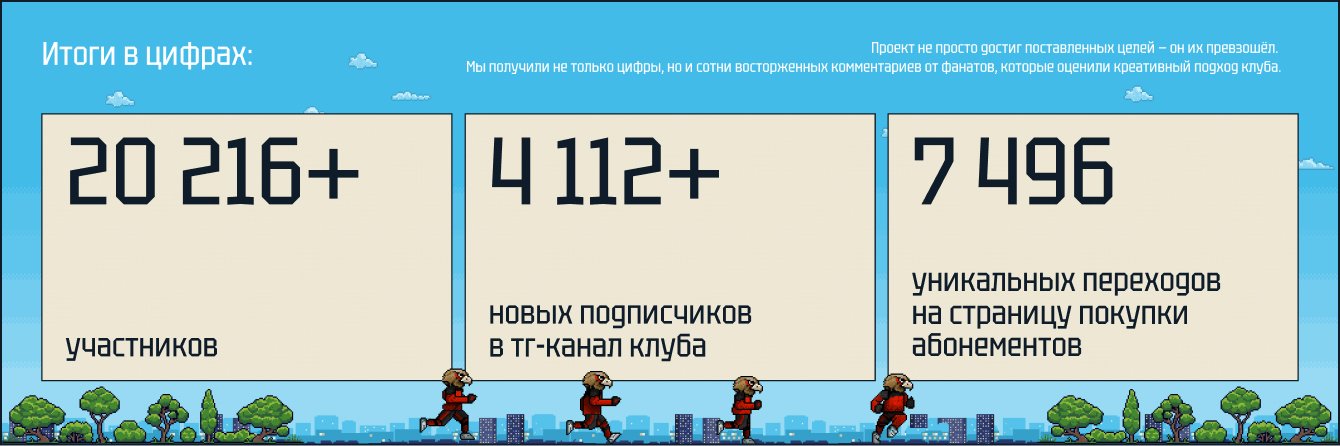 Более 20 000 человек играли, делились результатами, и мы видели, как это напрямую помогало продажам. Проект отлично прогрел аудиторию к старту продаж абонементов в игровом формате. Так же благодаре игры мы получили более 4000 тысяч новых подписчиков в Телеграм канал Клуба. Итоговый результат превзошел ожидания. TRIBE сделали игру, которая помогла и бизнесу, и фанатам!