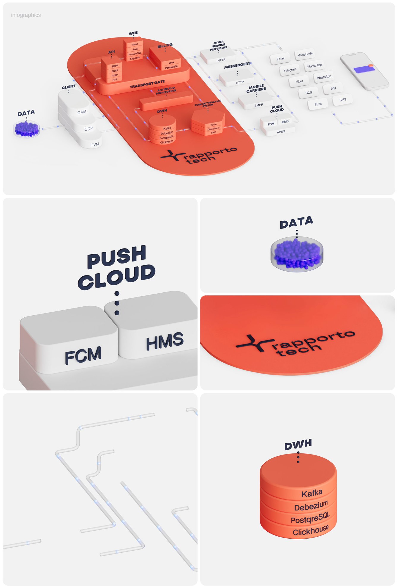 Мы использовали ее как способ объяснить продукт. Через абстрактные композиции визуализировали процессы: передачу данных, объединение каналов и управление потоками коммуникаций. 3D помогает сформировать целостное восприятие системы как единого управляемого механизма, а не набора разрозненных функций.