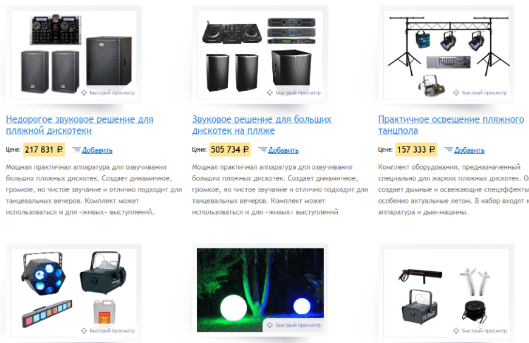 Мы проанализировали сайты конкурентов клиента — крупнейших компаний отрасли. Сайты не были клиентоориентированными: они предназначались для профессионалов, которые хорошо разбираются в оборудовании и могут все выбрать сами. При создании сайта мы сделали упор на широкую аудиторию. Загрузили подсказки, чтобы неопытный пользователь мог быстро собрать себе проект. Также были подобраны готовые проекты для конкретных задач: для ночных клубов, концертных залов и т.д.