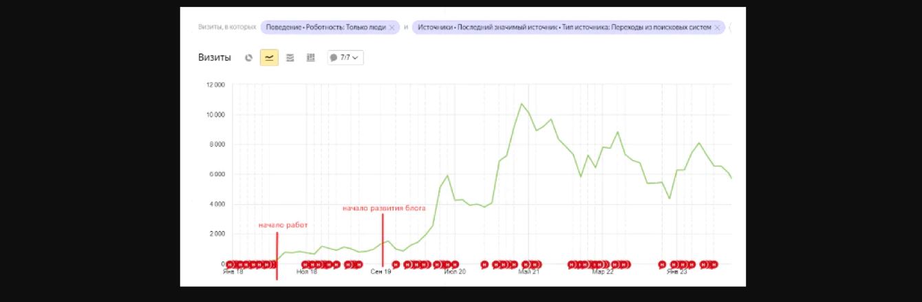 - запустили блог. Распределили семантику в соответствии с основными этапами пути пользователя: нашей задачей было привлечение не только горячего, но и теплого трафика, и его прогрев. После утверждения контент-плана начали заполнять статейный раздел: писали по одному небольшому материалу (3300 збп в месяц) или по одному лонгриду раз в 2 месяца. Составляя контент-план ориентировались на популярность запросов по месяцам и на блоги конкурентов. Весь контент генерировали заранее, чтобы статьи успели проиндексироваться к моменту повышения спроса на конкретную тему.