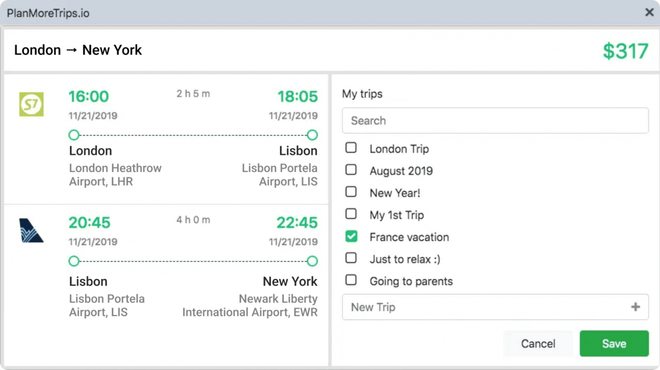 В PlanMoreTrips пользователи могут составлять планы поездок, выбирая рейсы и отели из предложений с 1000+ сайтов для путешественников, таких как Google Flights, Airbnb, Kayak, Skyscanner, United, Hotels.com. Расширение сохраняет все данные о полете для удобства сравнения и выбора лучшего варианта. Есть возможность добавить полет вручную, если он находится на сайте, который PlanMoreTrips пока не поддерживает.