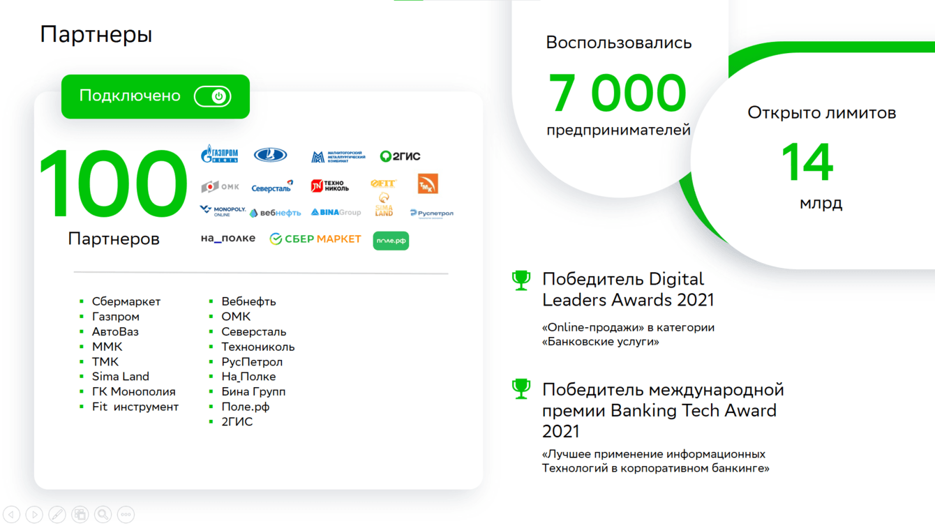 Сервис подключен на онлайн-площадках более 100 партнеров Банка, среди которых СберМаркет, Сима-Ленд, Газпромнефть, FIT инструмент, Северсталь и др. Рассрочка на покупки оформляется на срок 12 месяцев. При каждой оплате заказа первые 30 дней использовать деньги банка можно без процентов, далее —2,45% в месяц. Максимальный лимит в августе был увеличен с 1 до 3 млн рублей.