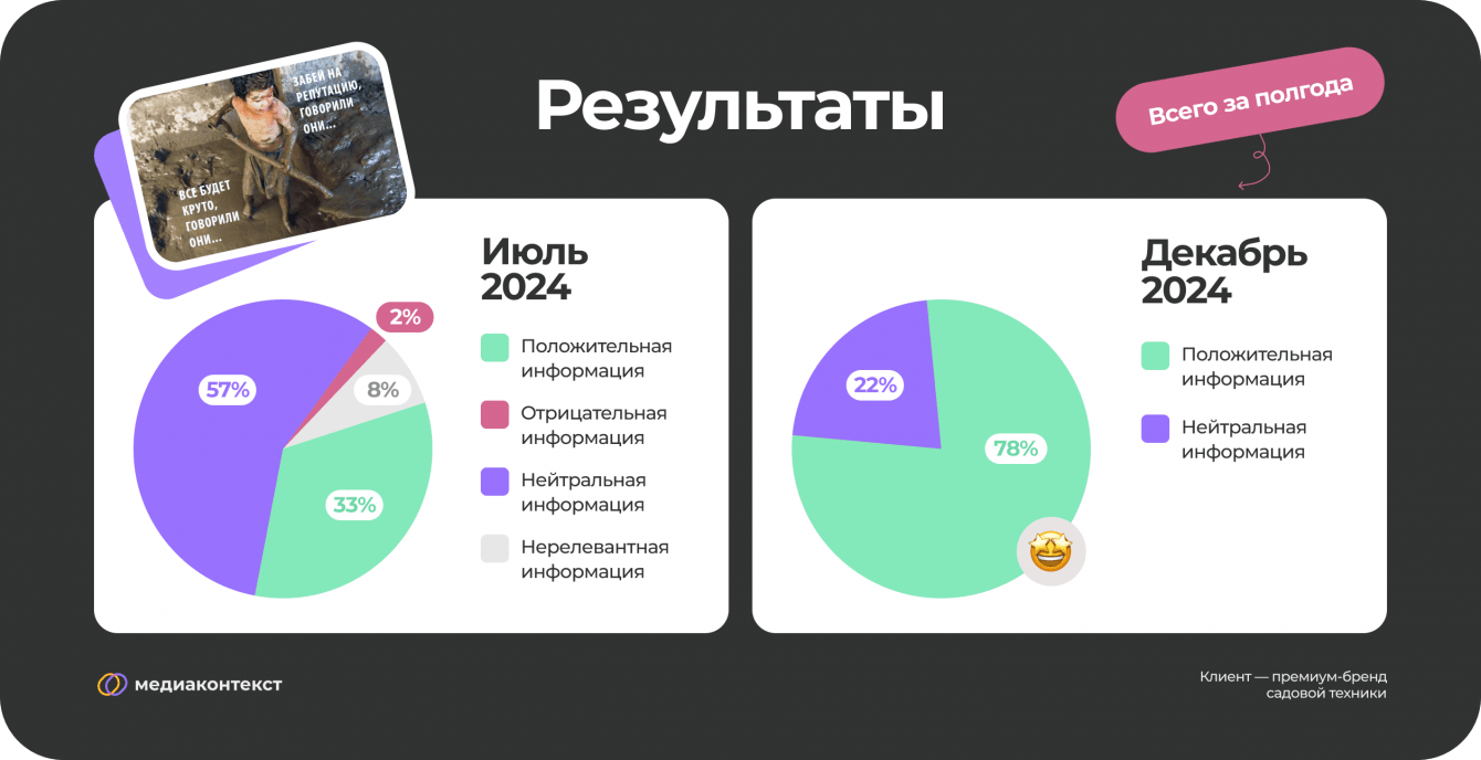 В рамках выполненного нашей командой комплекса мер по SERM репутационная выдача по основным брендовым запросам клиента содержит 78% положительной информации о продукции компании в различных источниках. Остальные 22% составляют нейтральные сайты, которые не оказывают негативного влияния на репутацию бренда. Сайты, имеющие негативную тональность, а также нерелевантные сайты в ТОПе отсутствуют.