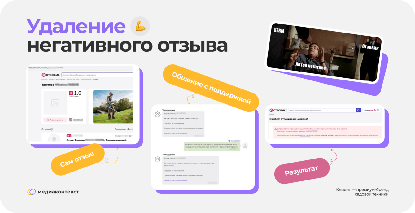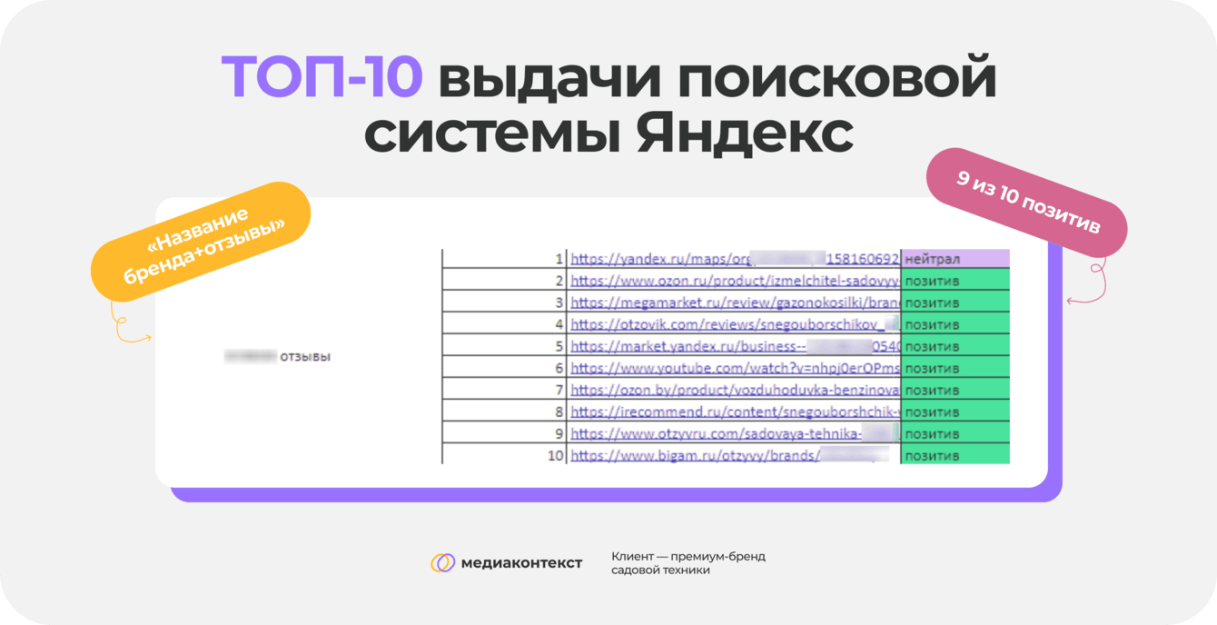 Улучшили репутацию бренда и инфополе продукции: по ключевому репутационному запросу «название бренда+отзывы» в ТОП10 Яндекса 9 из 10 сайтов несут положительную информацию.